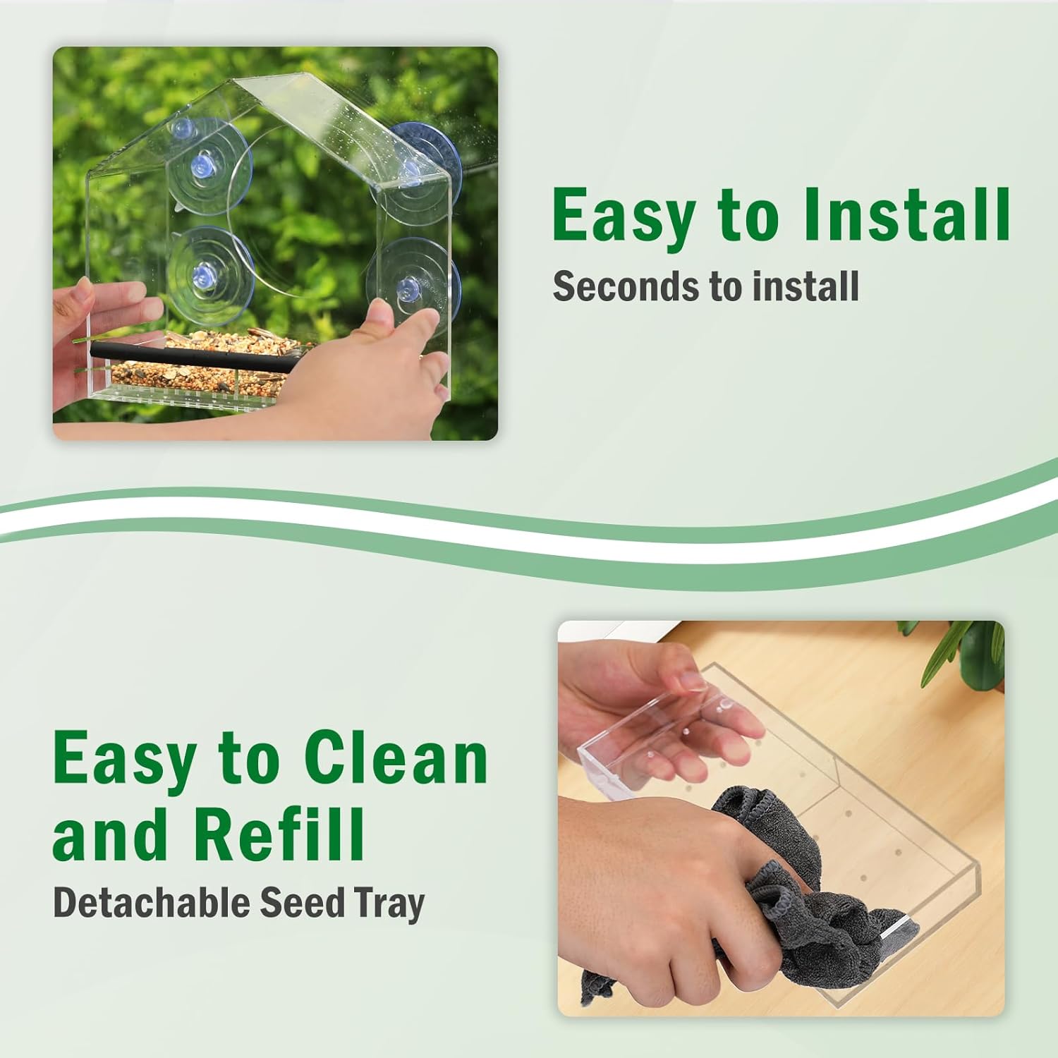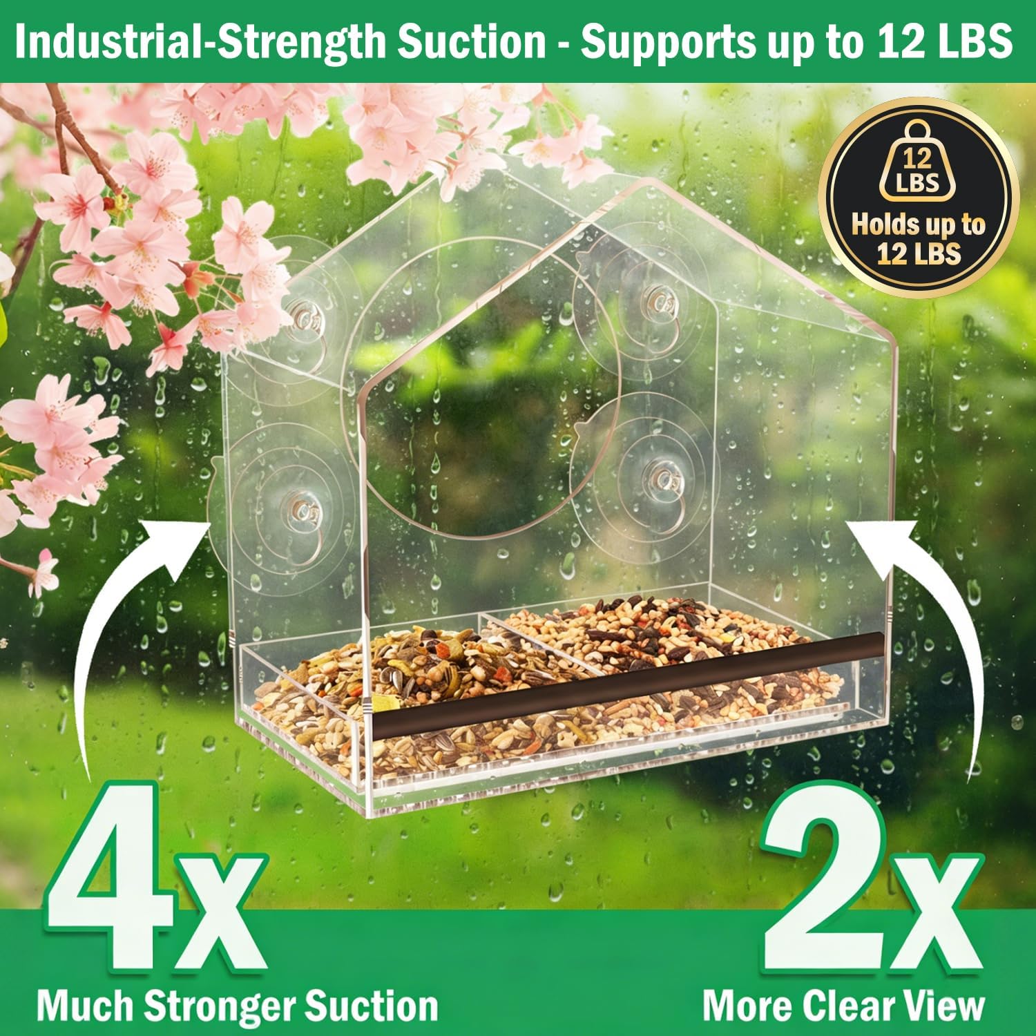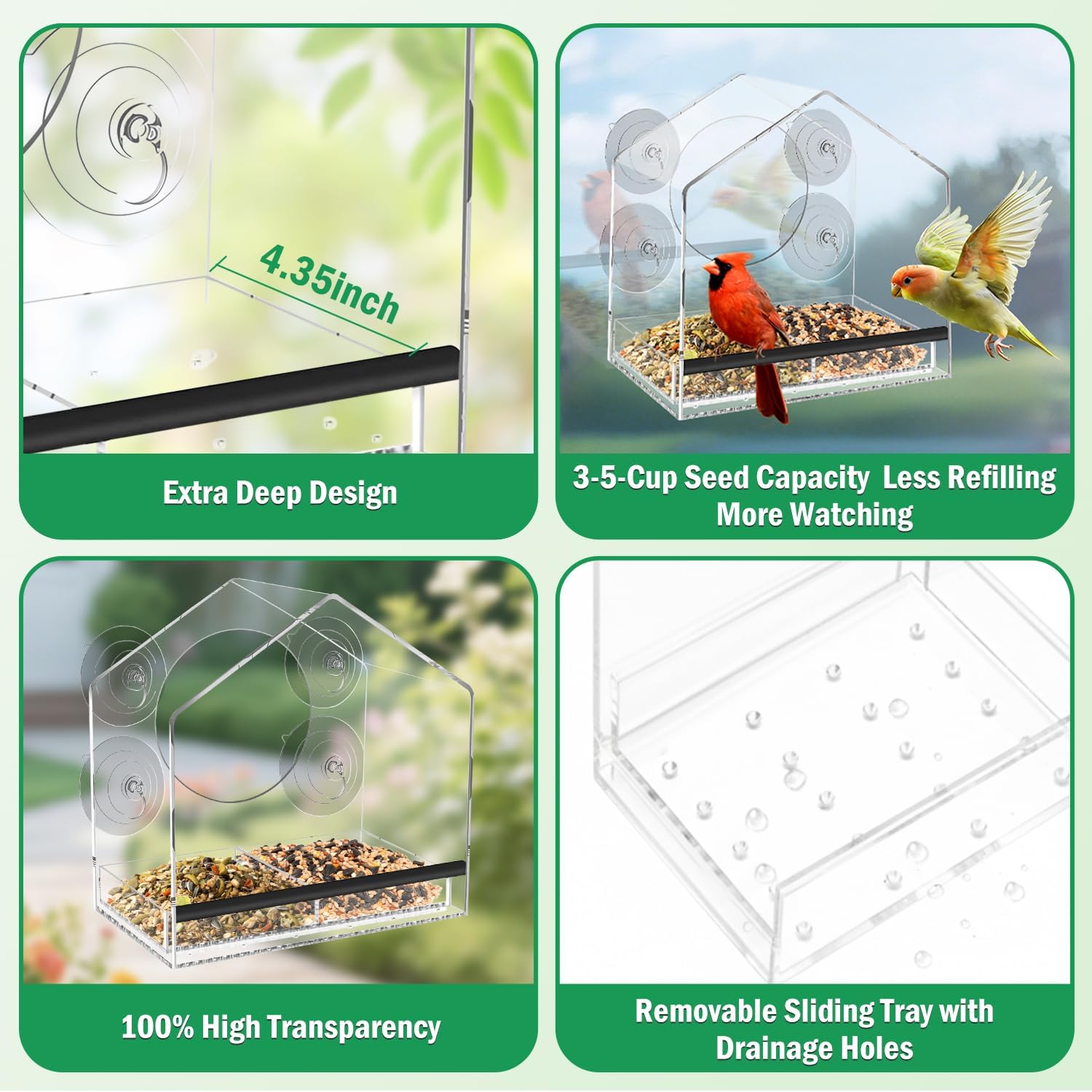 Editor's Pick: This window bird feeder is made of highly transparent acrylic material, providing a clear view for bird watching. It features 4 large 2.36-inch strong suction cups that can support up to 12 pounds, ensuring secure attachment. The 4.35-inch deep tray can hold more bird food, reducing frequent refilling. The removable tray design makes cleaning easy, while the laser-drilled drainage system keeps bird food dry. The 360-degree dome design prevents bird food from being scattered by wind.