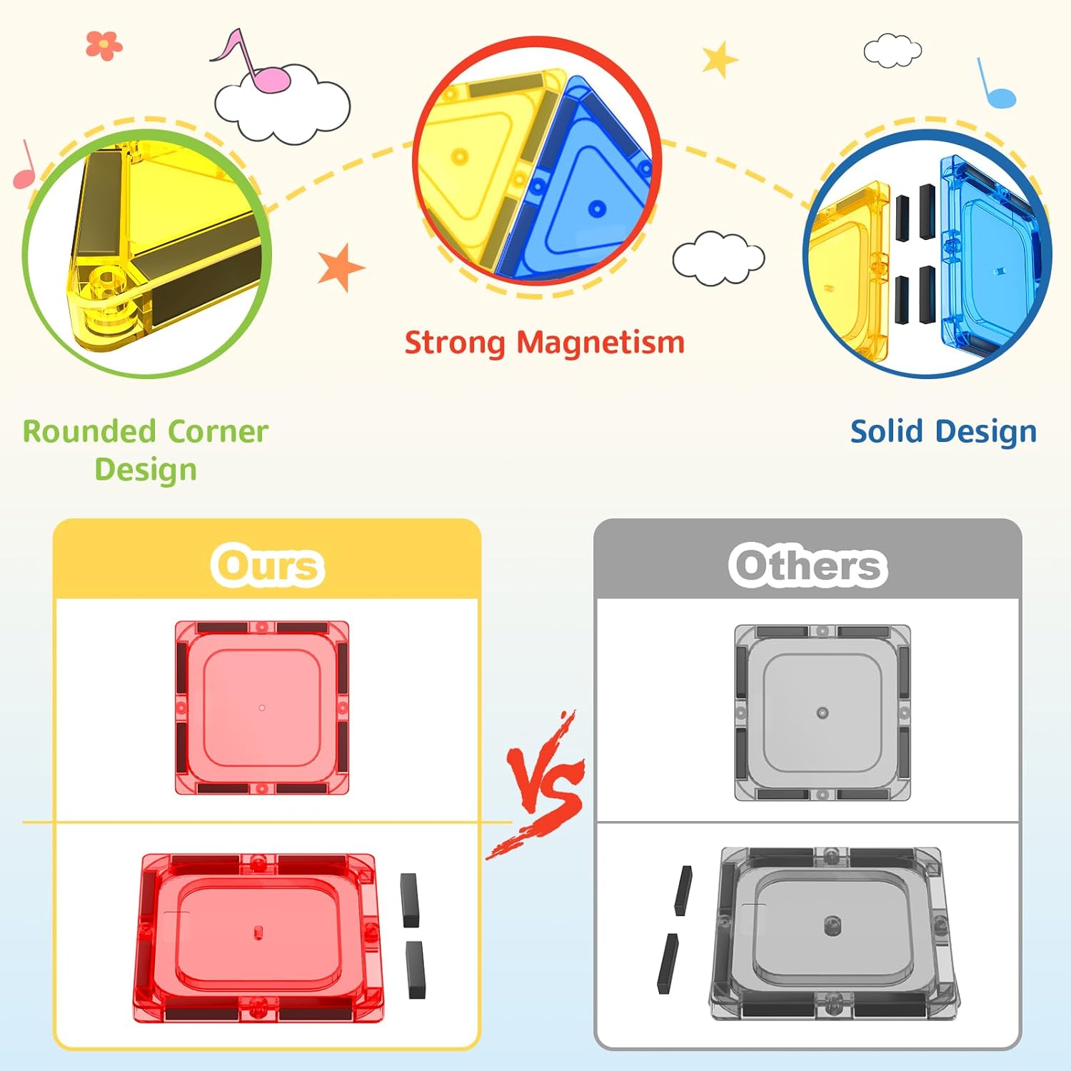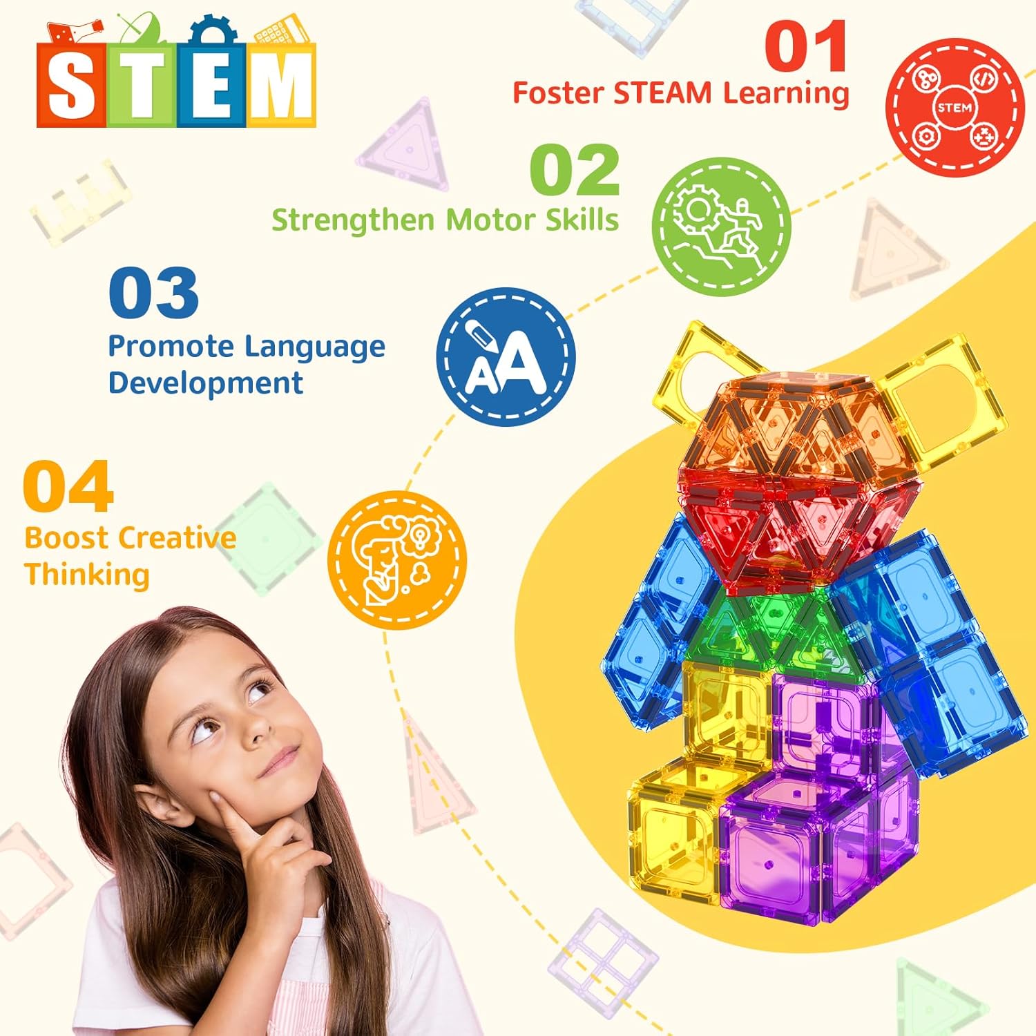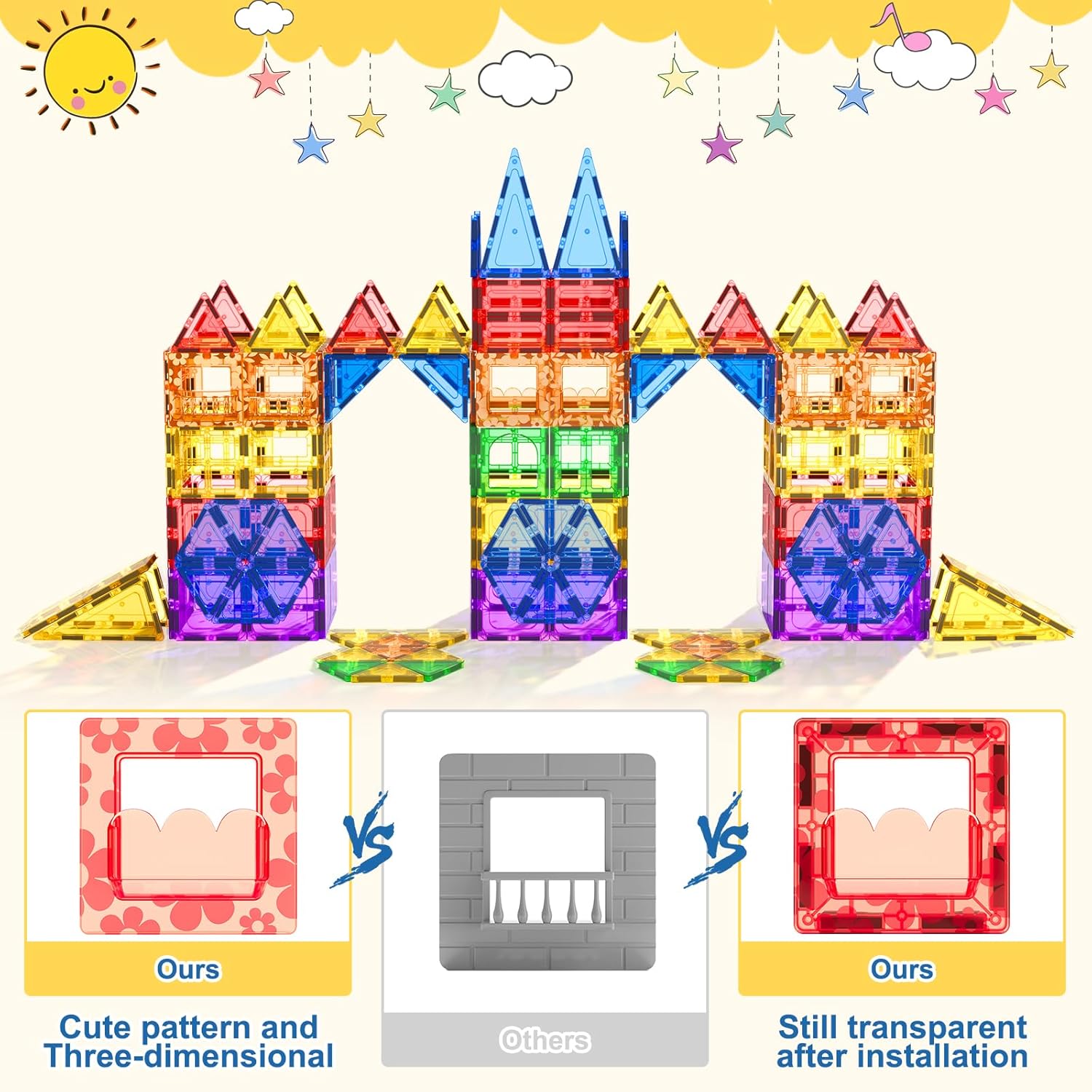 Editor's Pick: This magnetic tile set includes 60 rainbow-colored bricks, featuring unique balcony and awning accessories, allowing kids to build castles, villas, food trucks, and more. Made of high-quality plastic, it's durable and comes with a storage bag for easy organization and portability. As a STEM Montessori sensory toy, it helps develop hand-eye coordination, cognitive skills, and creativity, suitable for children ages 3 and up at home or in the classroom.