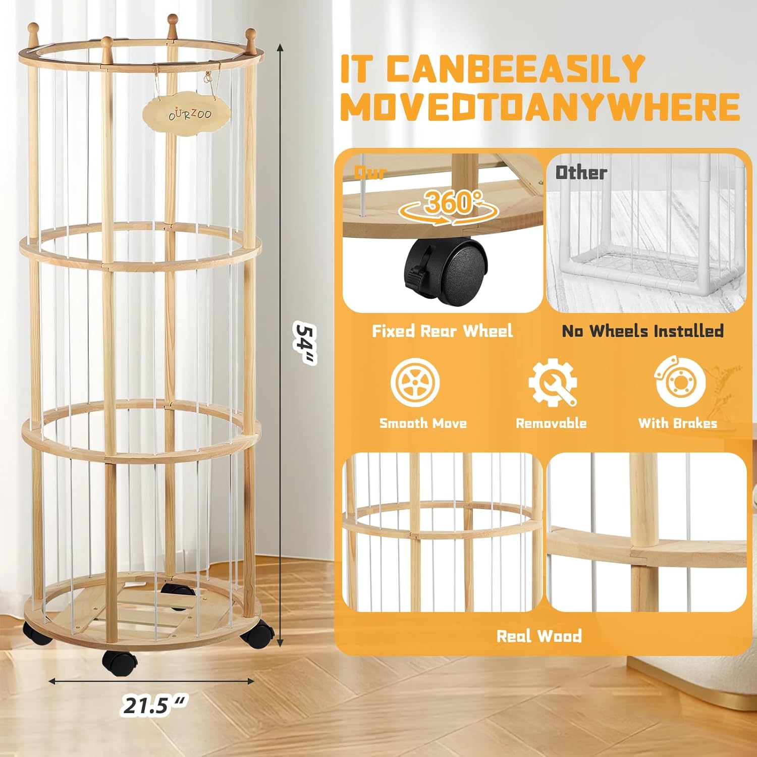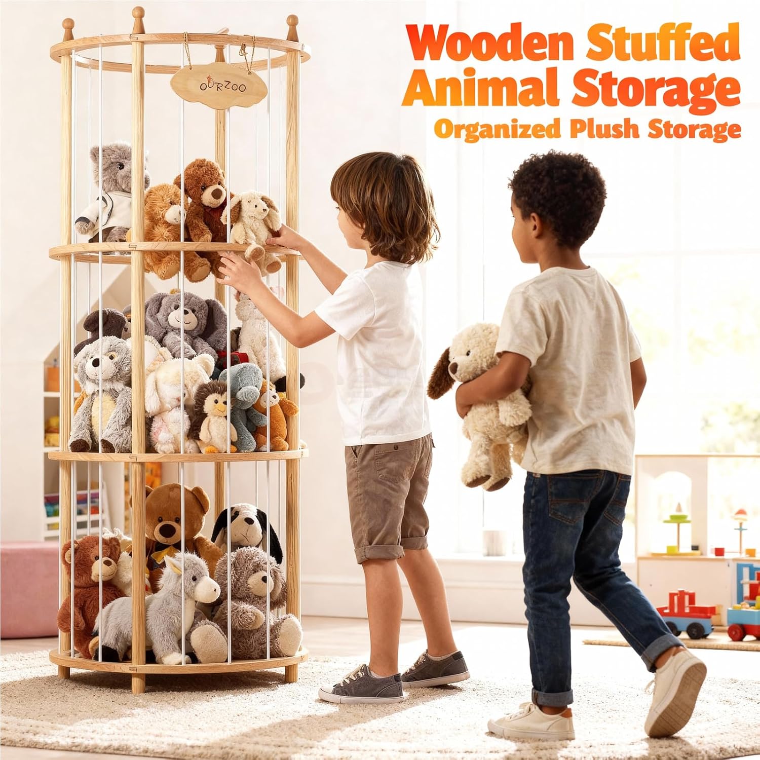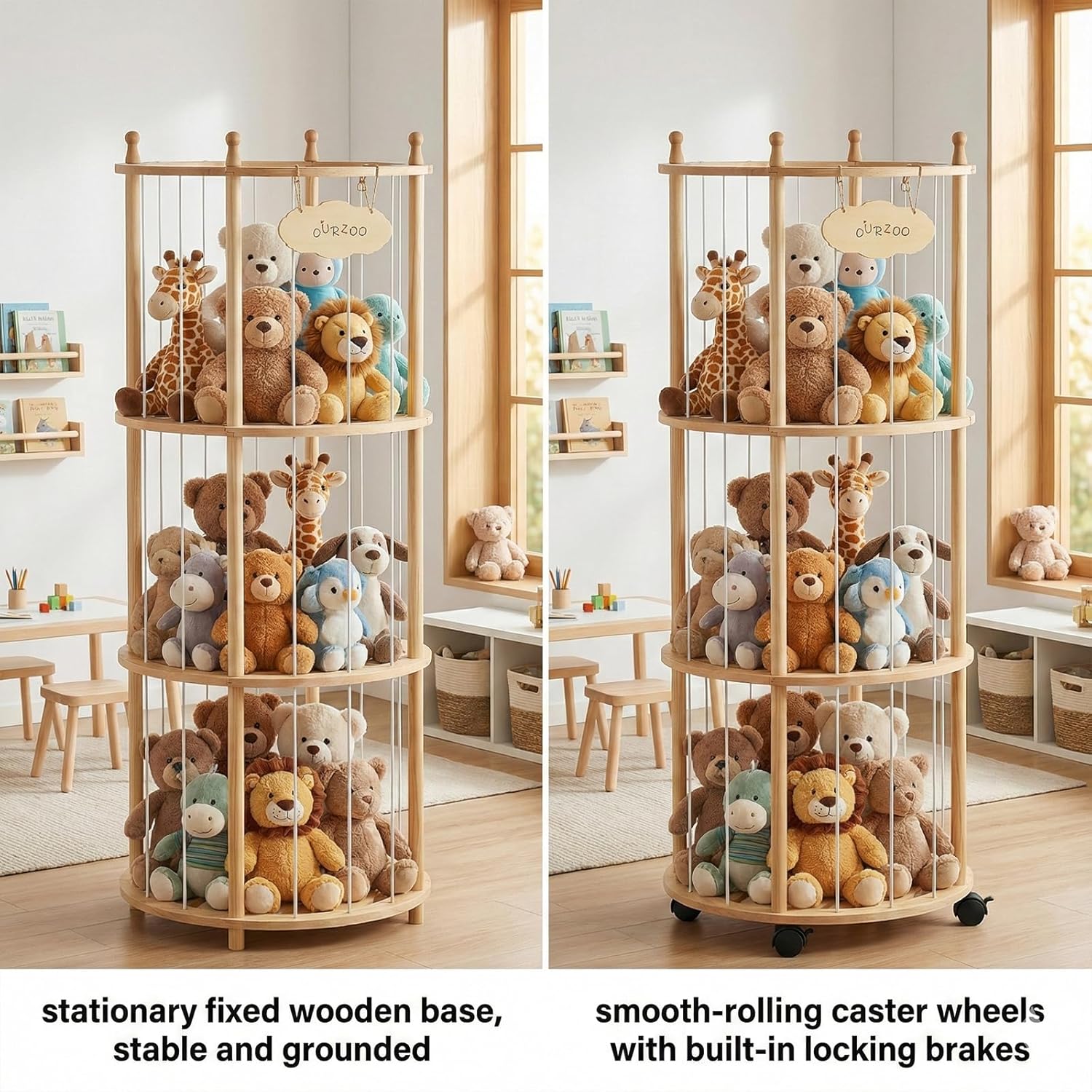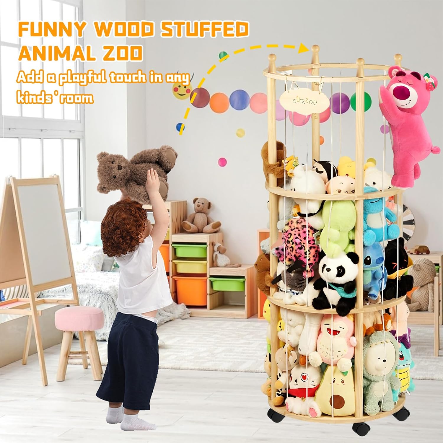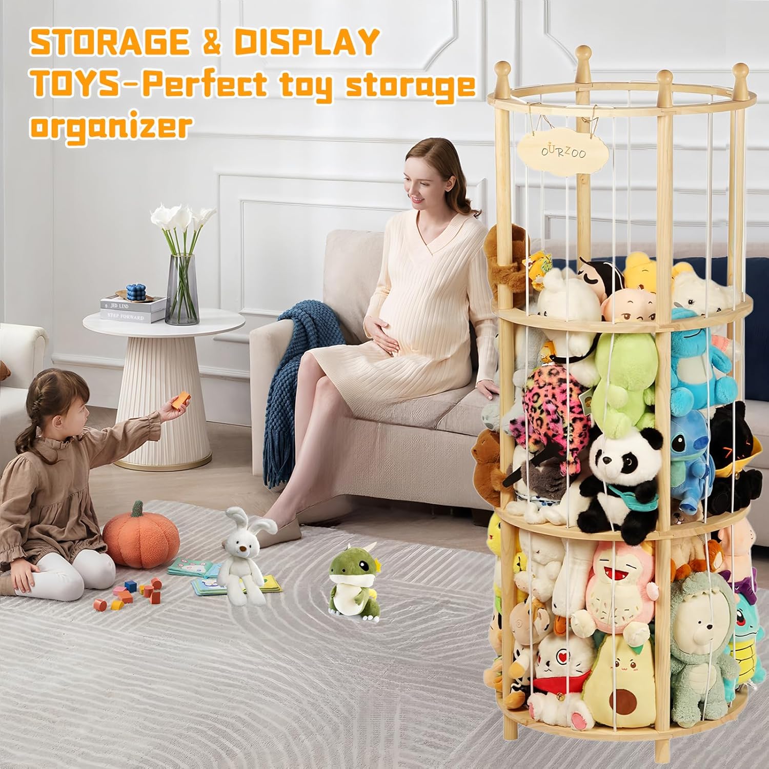 Editor's Pick: This solid wood vertical storage organizer is designed specifically for organizing and displaying plush toys. The sturdy wooden frame ensures stability for everyday use. The space-saving circular vertical structure maximizes storage capacity while reducing floor space. The open-tiered design makes stuffed animals visible at a glance and easily accessible, helping to keep your environment tidy. Available with either a fixed base or optional lockable caster wheels to accommodate different room layout needs.