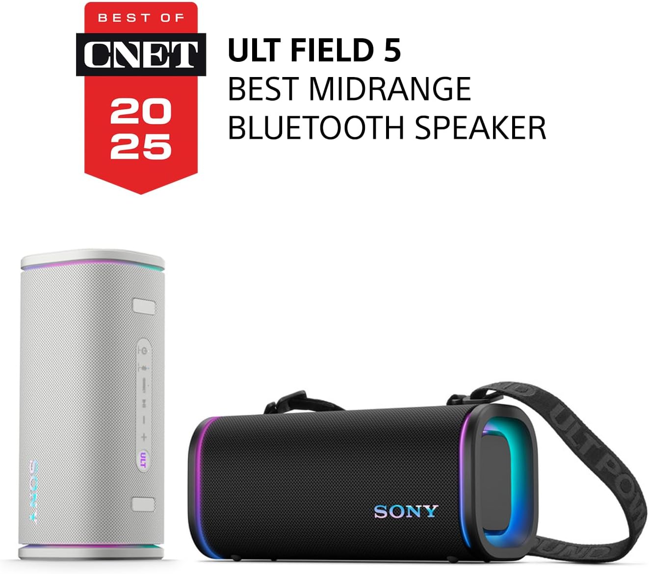 Editor's Pick: This Sony portable Bluetooth speaker features IP67 water and dust resistance for durability. It has a dedicated ULT button to enhance bass with one touch, delivering deeper and fuller sound. The two-way active design with dedicated woofer and tweeter ensures high-quality sound across the full frequency range. With up to 25 hours of battery life and fast charging capability, plus adjustable ambient lighting and a shoulder strap, it balances practicality with party atmosphere.