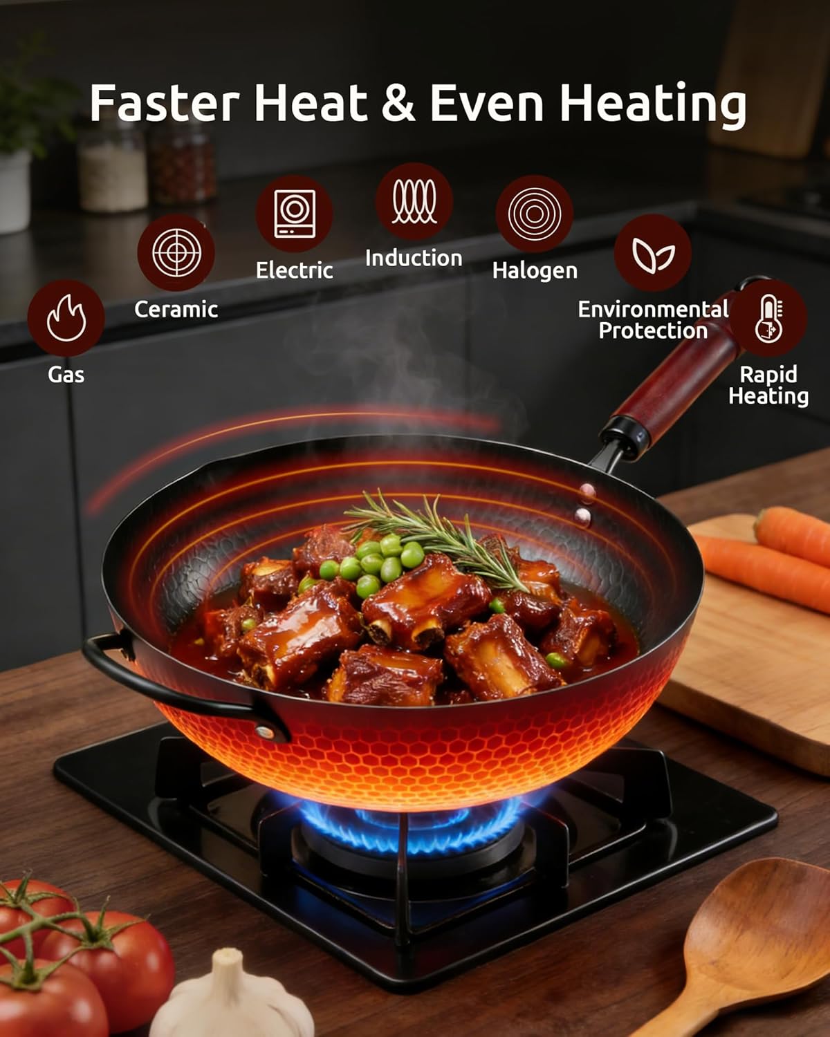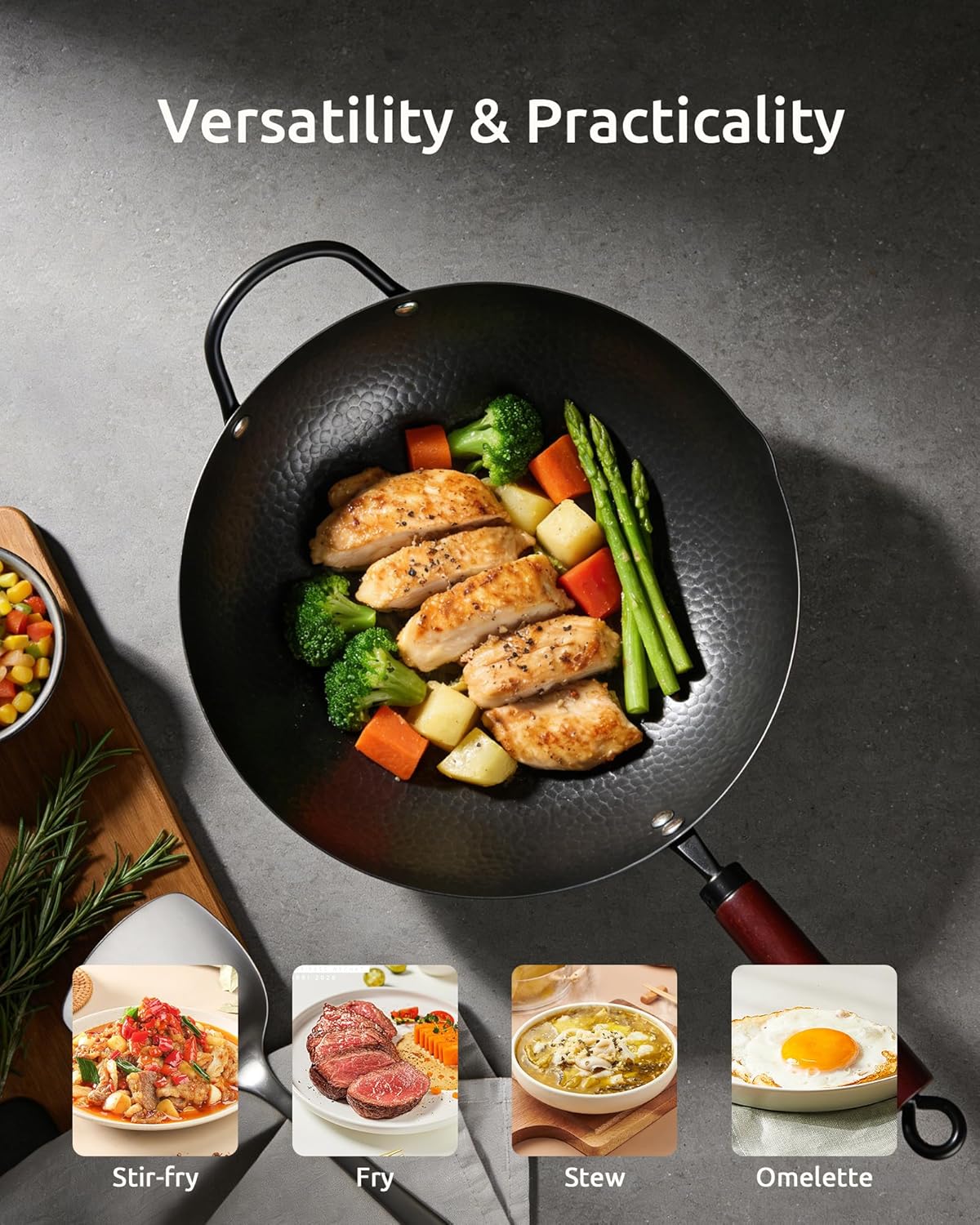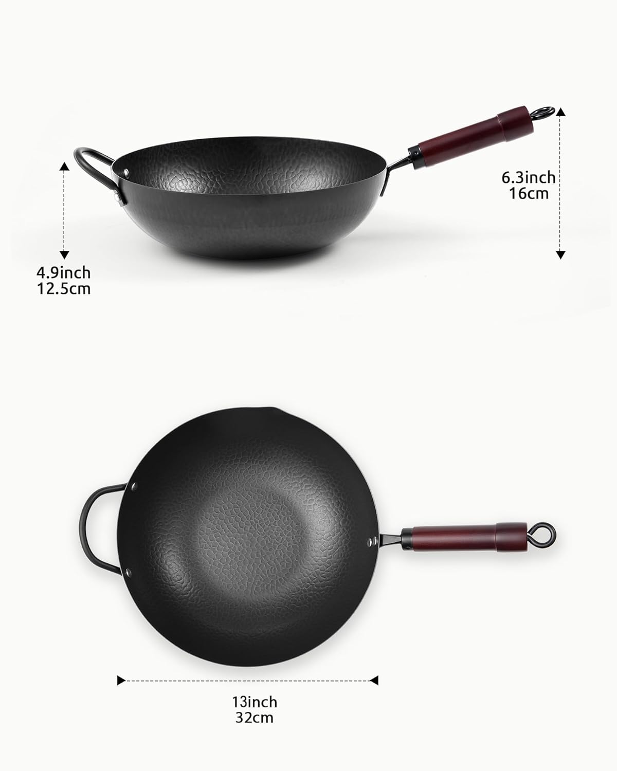 Editor's Pick: This 13-inch carbon steel wok features a flat bottom design compatible with all cooking surfaces, including induction stoves. The pre-seasoned wok naturally develops a non-stick surface with continued use, making it perfect for Chinese stir-frying, pan-frying, and stewing. The included wooden lid, unlike glass or metal alternatives, better retains heat and steam to preserve food flavors while preventing condensation from lowering the cooking surface temperature.