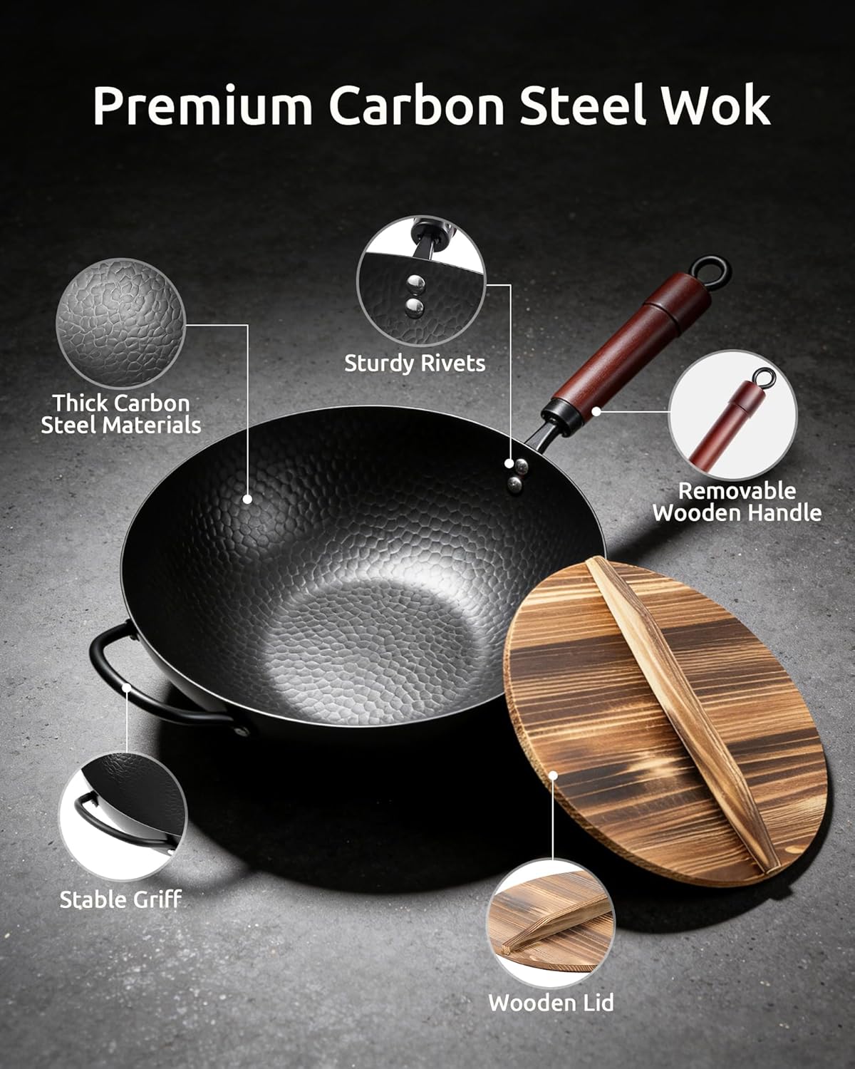 FGJ Carbon Steel Wok Pan 13 Inch with Wooden Lid
