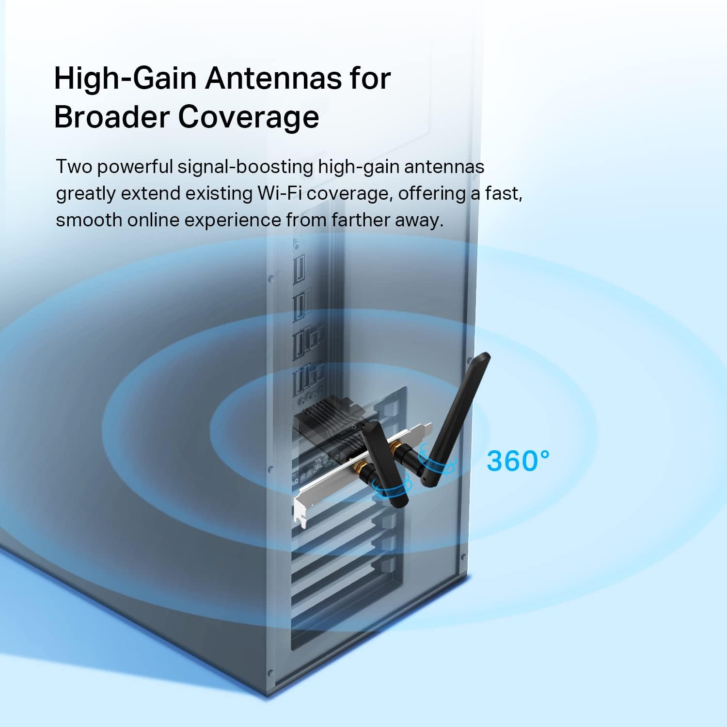 Editor's Pick: This WiFi 6 wireless network card supports high-speed connections up to 2.4 Gbps, effectively reducing network latency through OFDMA and MU-MIMO technology, perfect for online gaming or immersive VR experiences. It features dual high-gain antennas to enhance signal coverage, along with integrated Bluetooth 5.2 for connecting gaming controllers, headphones, and other peripherals. Supports the latest WPA3 security protocol to ensure secure data transmission. Comes with both standard and low-profile brackets, compatible with different computer cases.