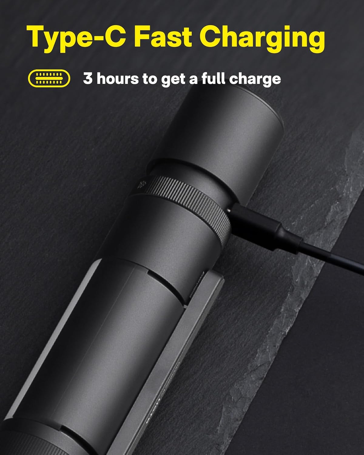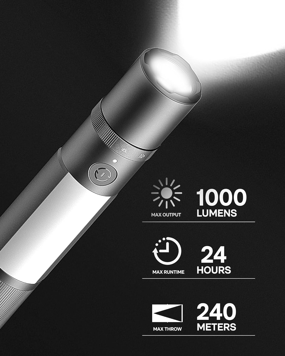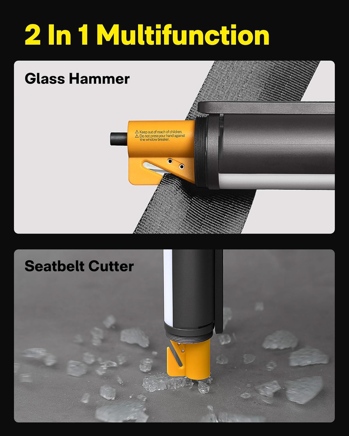 Editor's Pick: This multifunctional flashlight combines high-brightness illumination with emergency tools. The main light reaches up to 1000 lumens with a beam distance of 787 feet (240 meters), and features a spotlight/floodlight adjuster. The side light provides red warning and fog light flashing modes. It includes a built-in safety belt cutter and pop-out window breaker, with design focused on safety protection. The magnetic base with a 107° rotating rail allows hands-free lighting, perfect for car maintenance, camping, and emergency situations.