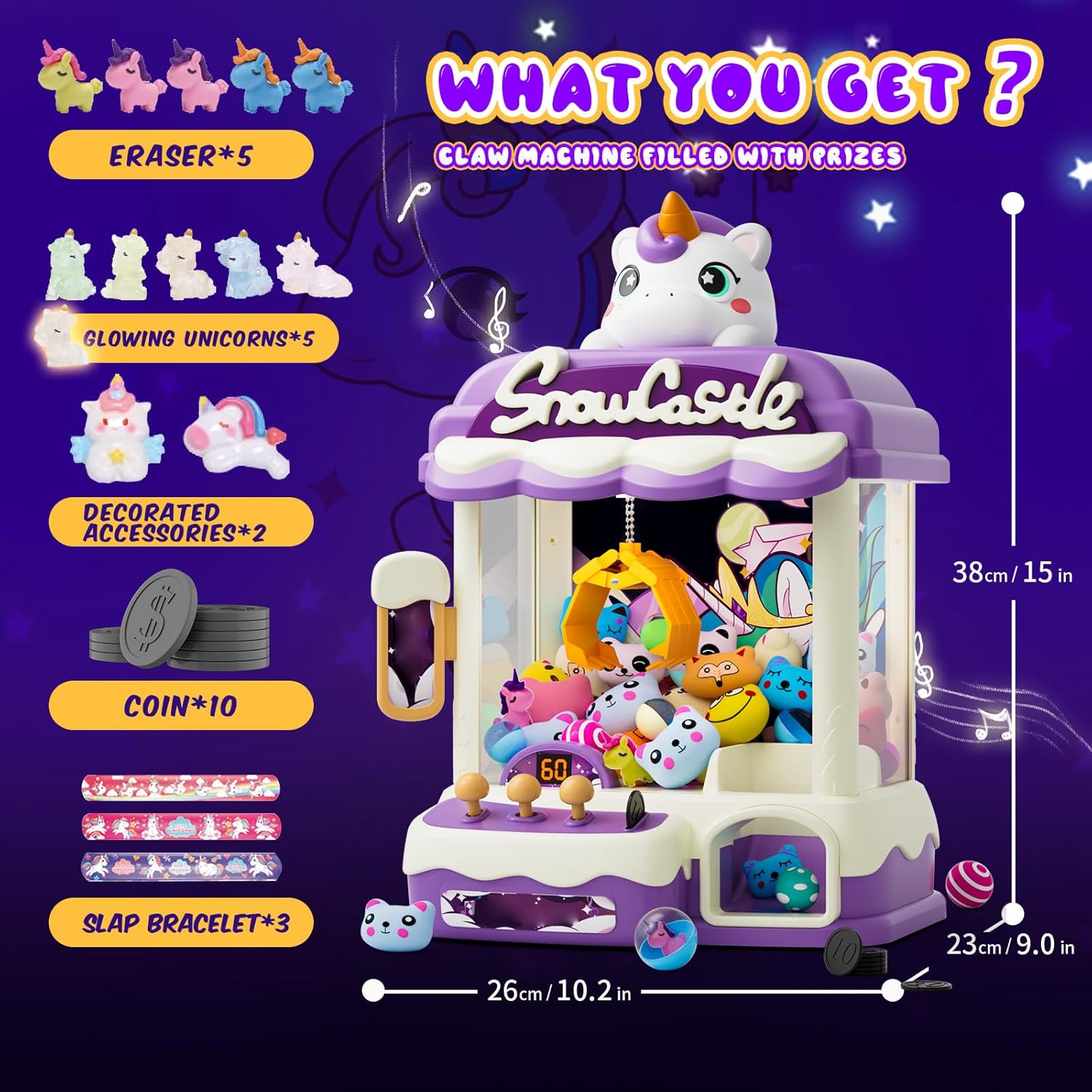 Editor's Pick: This large claw machine features a unicorn theme design with vibrant colors, built-in light effects and fun music, creating a playful arcade atmosphere. The three-control joystick simulates a real claw machine experience, helping children develop hand-eye coordination and concentration. It comes with various unicorn plush toys, small toys, and stationery accessories. Suitable for children 6 years and older, it's perfect for family entertainment, gatherings with friends, and birthday parties. Easy to operate, it supports both USB and battery power, with safety-edge processing suitable for children's daily play.
