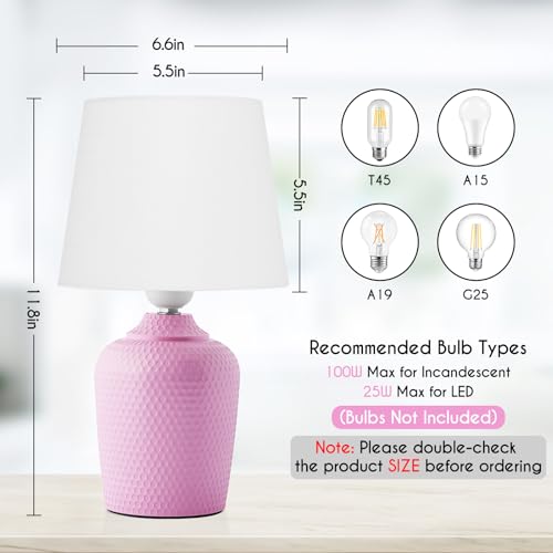 Editor's Pick: This pink table lamp set includes two compact bedside lamps measuring 11.8 inches tall, perfect for smaller bedrooms, children's rooms, or home offices. The lamp bases feature a unique textured design paired with pure white fabric lampshades for a modern and cute appearance. Easy to install, they come with 5.4-foot power cords and standard E26 lamp sockets compatible with various bulb types.
