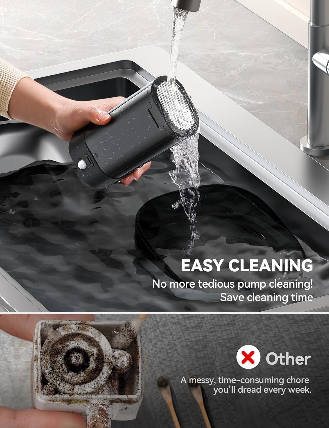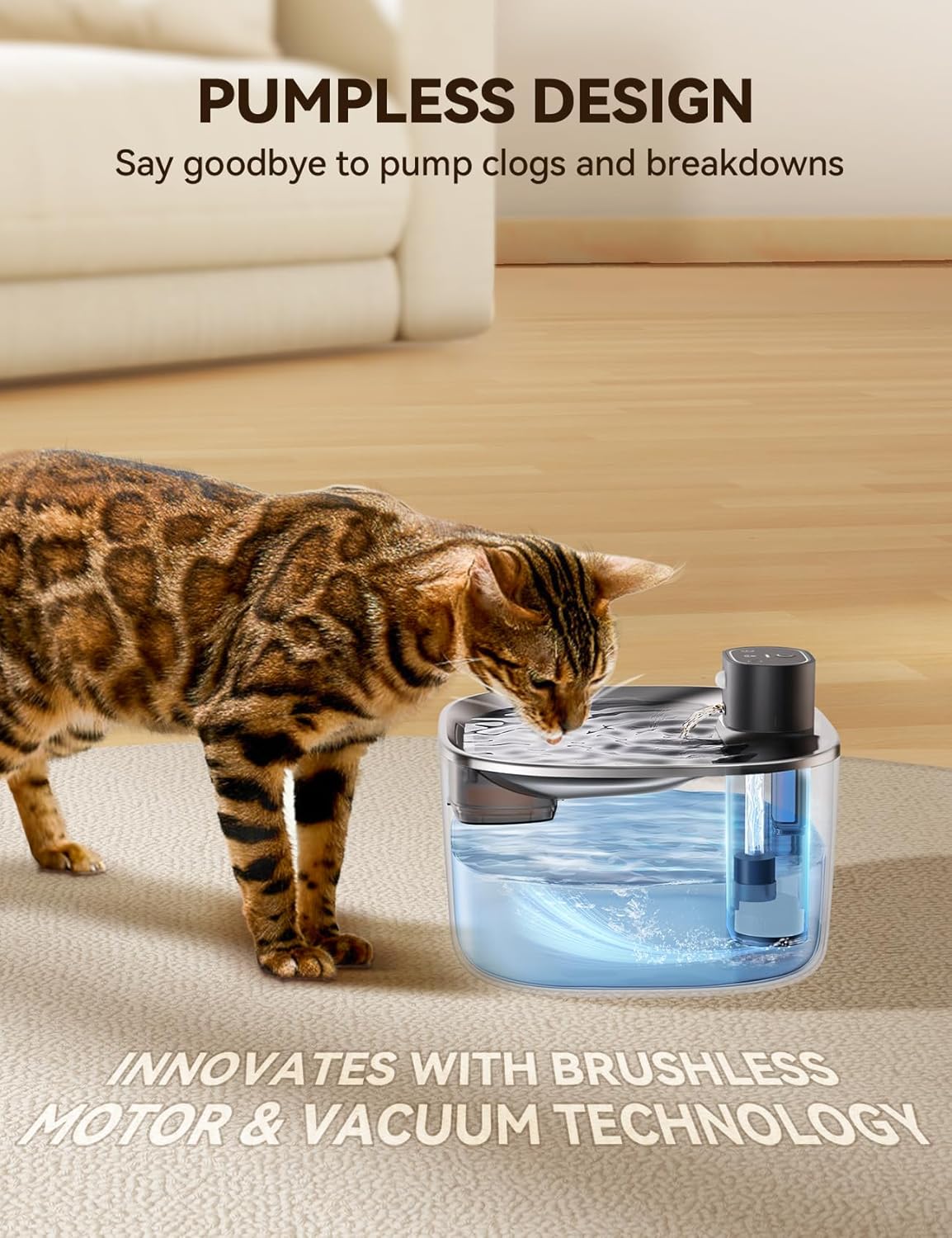 Editor's Pick: This wireless cat water fountain features a pump-free design, avoiding the clogging and cleaning issues common with traditional water pumps. It includes a removable 4000mAh rechargeable battery that can operate wirelessly for up to 45 days, allowing for flexible placement. The smart dual-mode system includes a sensor mode that activates water flow when your cat approaches, and a circulation mode that refreshes the water every 15 minutes to maintain freshness. The 4-liter capacity stainless steel tray is perfect for multi-cat households, while the five-layer filtration system further purifies the water. LED indicators provide alerts for water level, battery status, and filter condition.