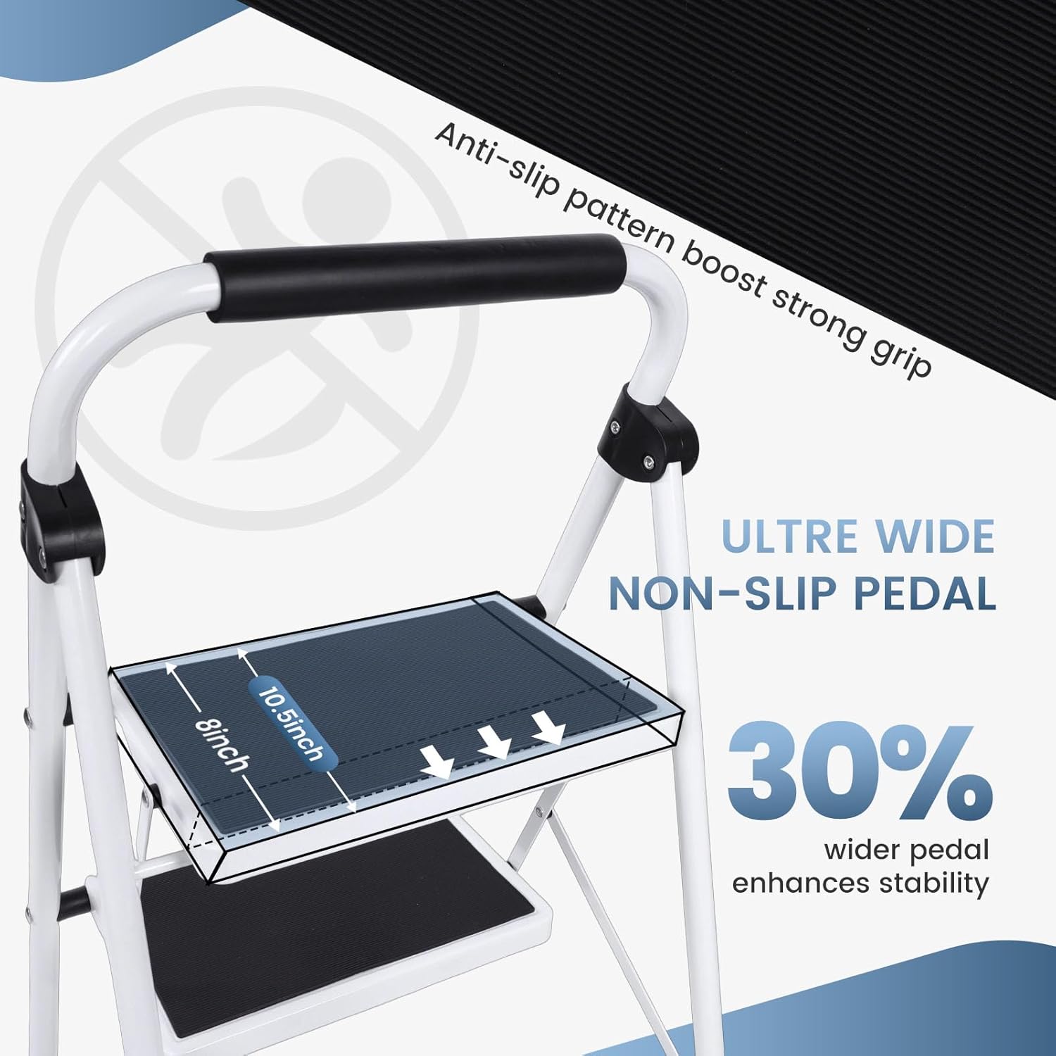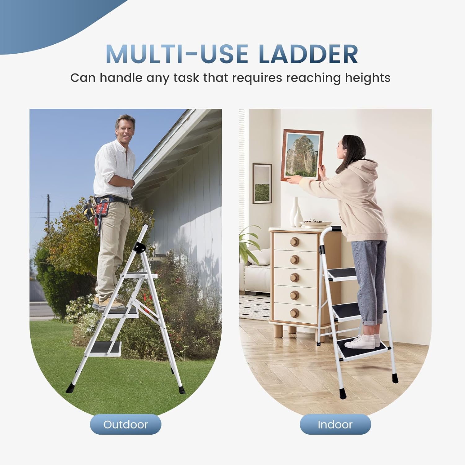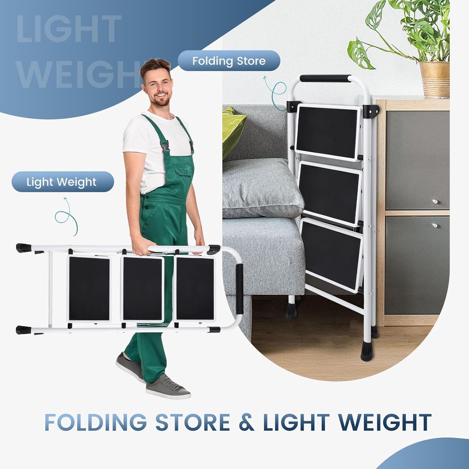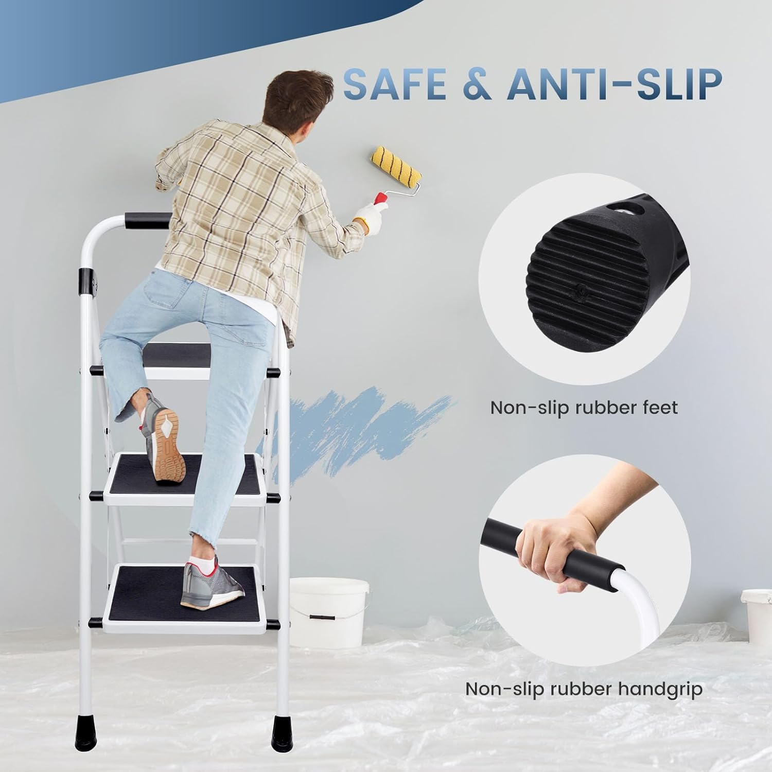 Editor's Pick: This three-step stool features a widened anti-slip pedal design with a textured surface for stable footing, reducing the risk of slipping. The rubber-wrapped handrail provides a comfortable grip, and the non-slip foot pads ensure stability during use. Made of high-strength steel, it can support up to 330 lbs and folds to just 2 inches thick for easy storage in tight spaces. Perfect for reaching high cabinets in the kitchen, changing light bulbs, or outdoor tasks.