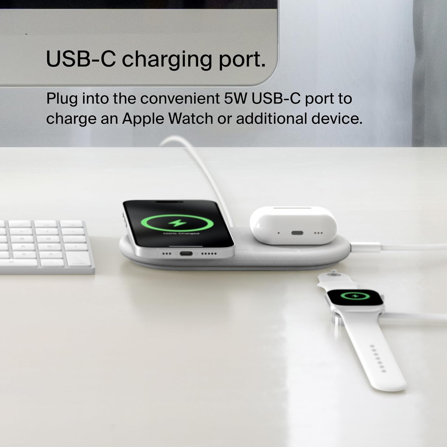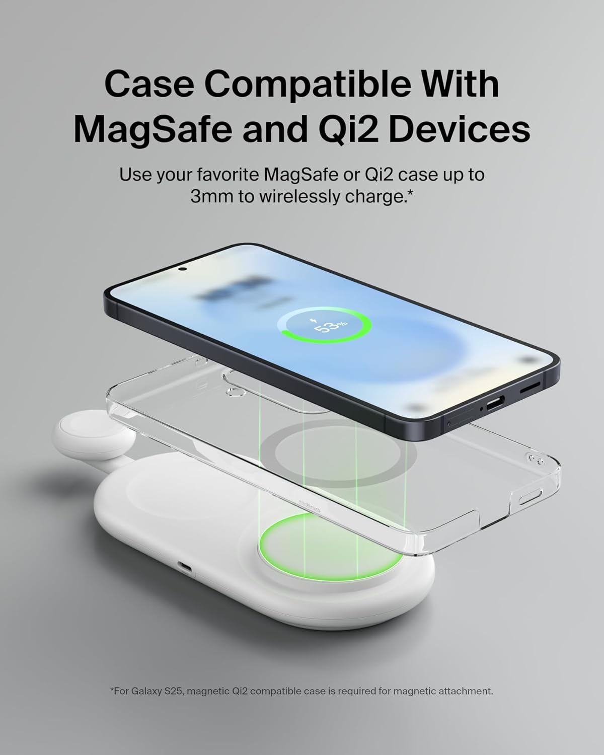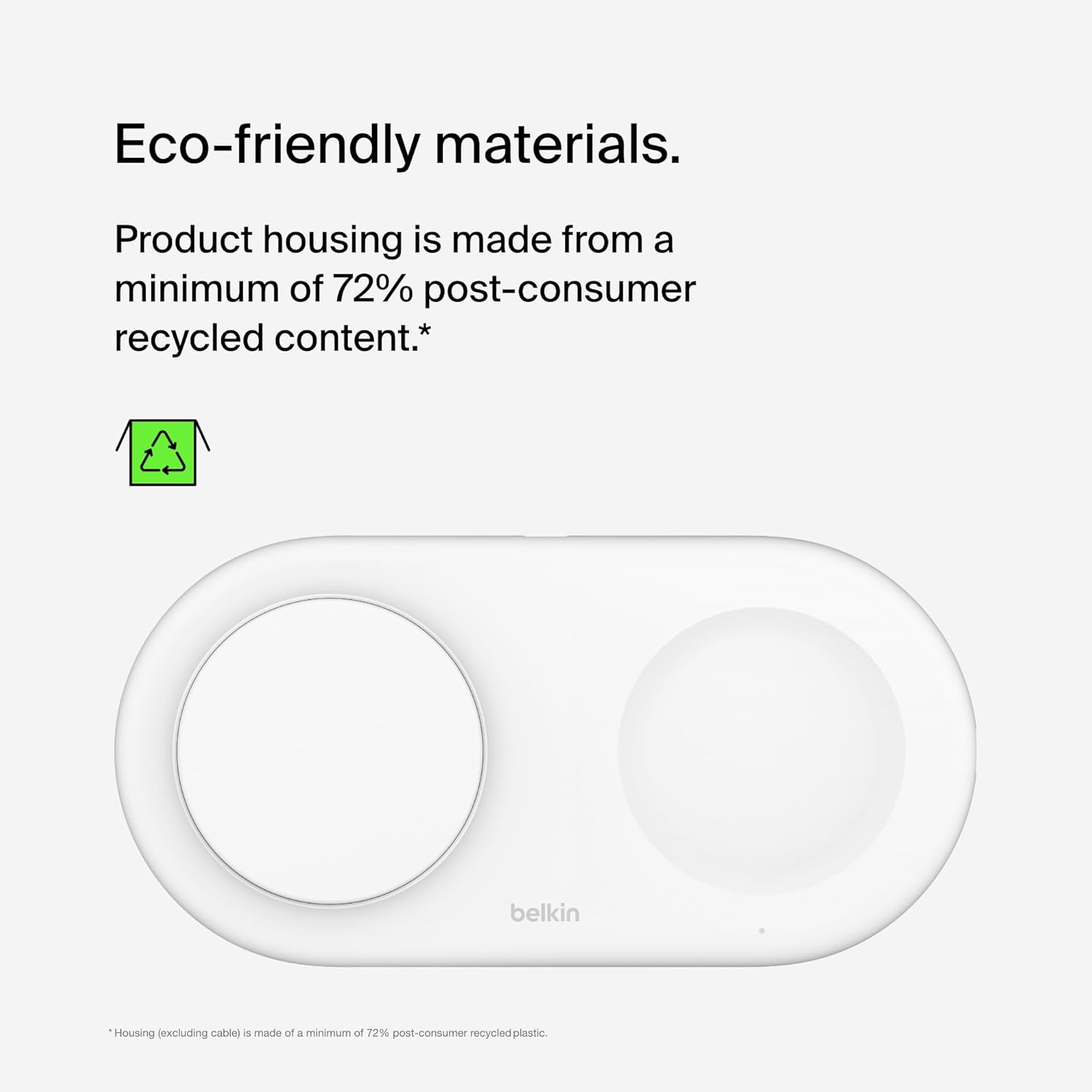 Editor's Pick: This 2-in-1 wireless charging pad features the latest Qi2 technology, supporting magnetic fast charging up to 15W and compatible with MagSafe. It maintains a stable charging connection even with protective cases up to 3mm thick. It includes an additional 5W Qi charging spot and a USB-C output port, allowing you to power three devices simultaneously (such as an iPhone, AirPods, and Apple Watch). The compact, lightweight design is perfect for travel, and the built-in LED indicator displays charging status. The product housing is made from over 72% post-consumer recycled materials with 100% plastic-free packaging, and comes with a two-year warranty.