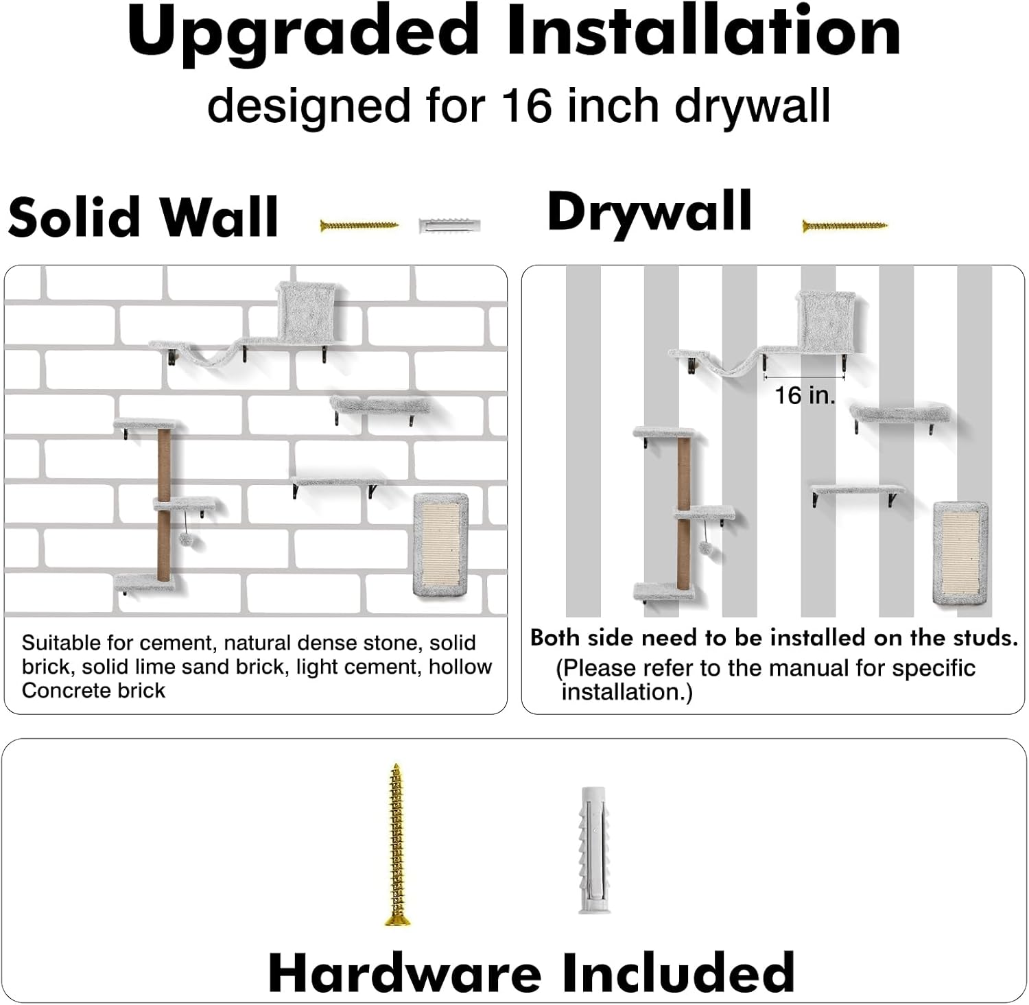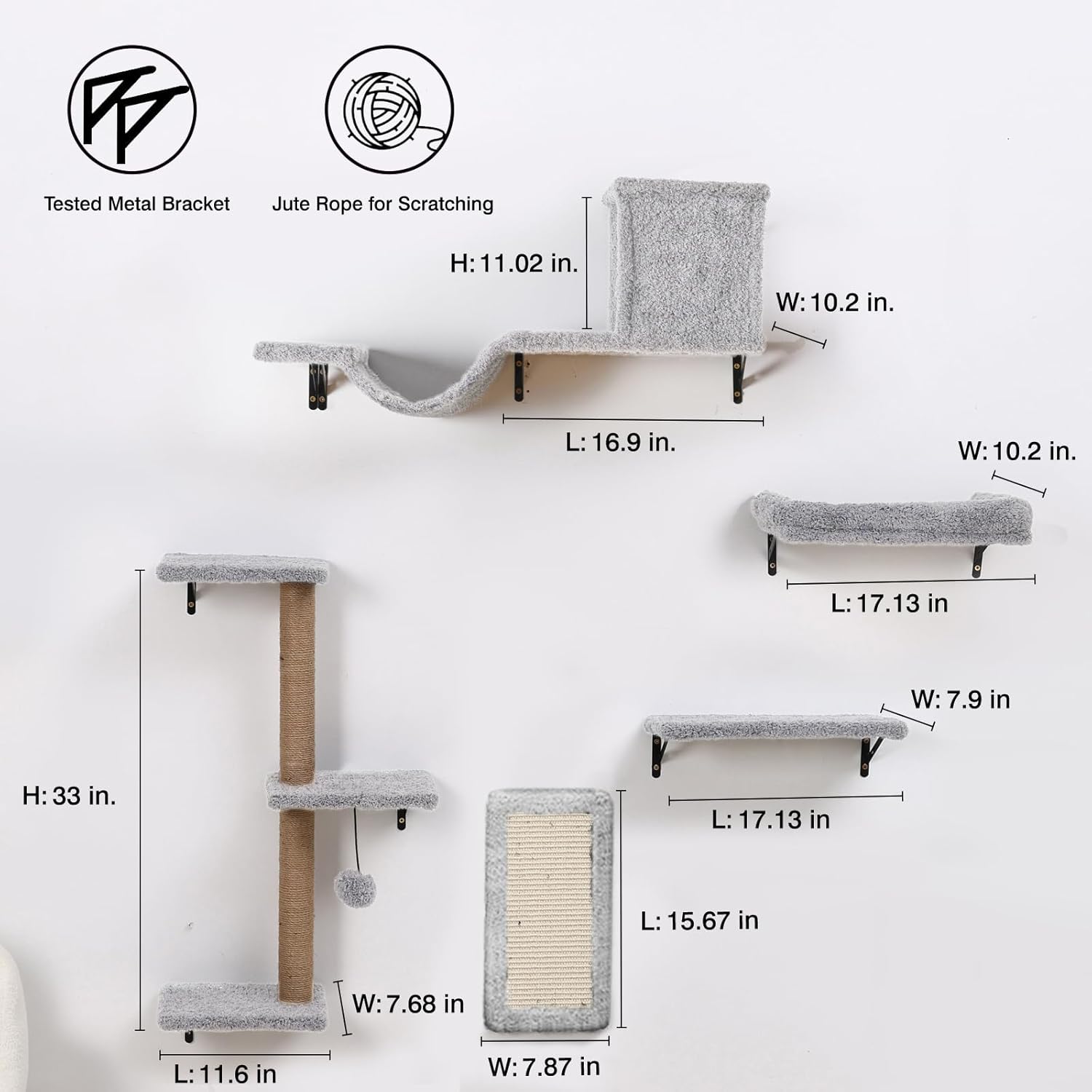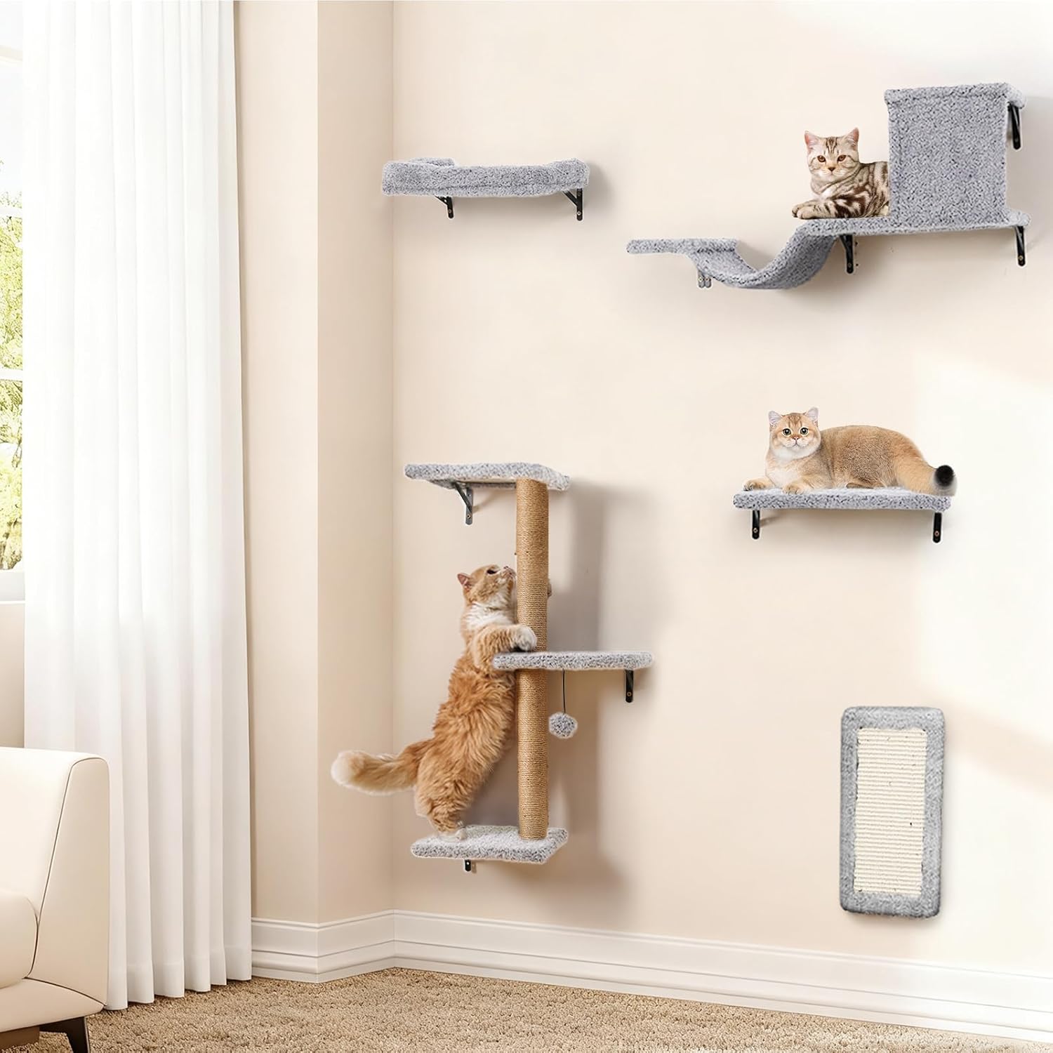 Editor's Pick: This 5-in-1 cat wall shelf is made from multi-layer natural wood with reinforced connections at key points, supporting up to 40 pounds. The modular design includes resting platforms, bridges, and scratching posts that can be freely combined to create a three-dimensional play space. The surface is covered with soft pink velvet fabric that feels comfortable and is easy to maintain, providing cats with a multifunctional area for climbing, resting, and scratching.