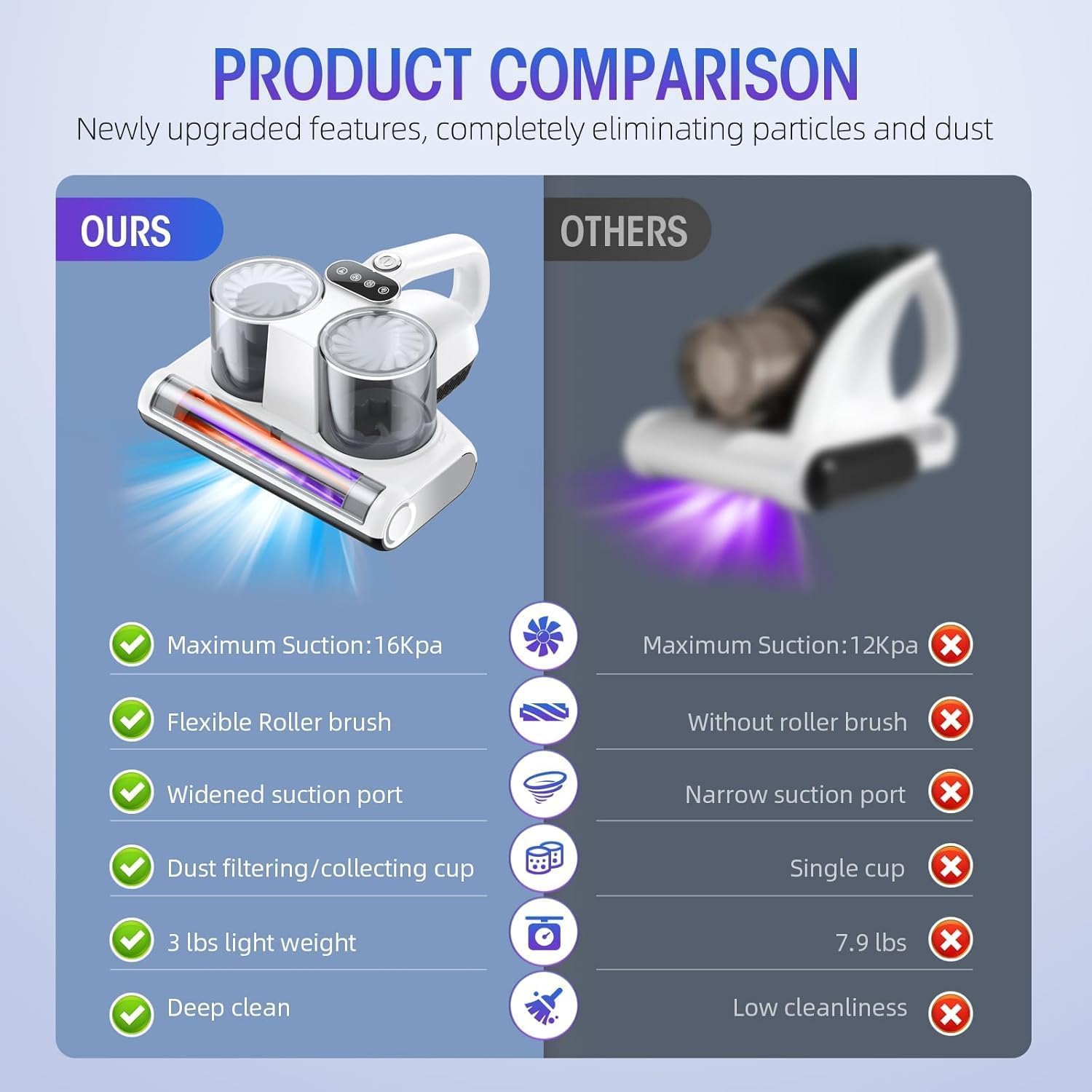 Editor's Pick: This anti-dust mite vacuum integrates five cleaning technologies, including a 253.7nm UVC ultraviolet lamp, 140℉ hot air, 30000 RPM high-speed rolling brush, 16Kpa strong suction, and ultrasonic function, designed to eliminate hidden dust, pet dander, and pollen at the source. Equipped with a 500W high-performance motor and widened suction inlet, it efficiently cleans mattresses, carpets, and sofas. The anti-clogging dual-cup filtration system captures 99.97% of 0.3-micron particles, and the filter cup is detachable and washable. A built-in gravity sensor ensures the UVC lamp only activates when the device is placed flat on a surface for safer use. The lightweight design with a long power cord makes it convenient for deep cleaning throughout your home.
