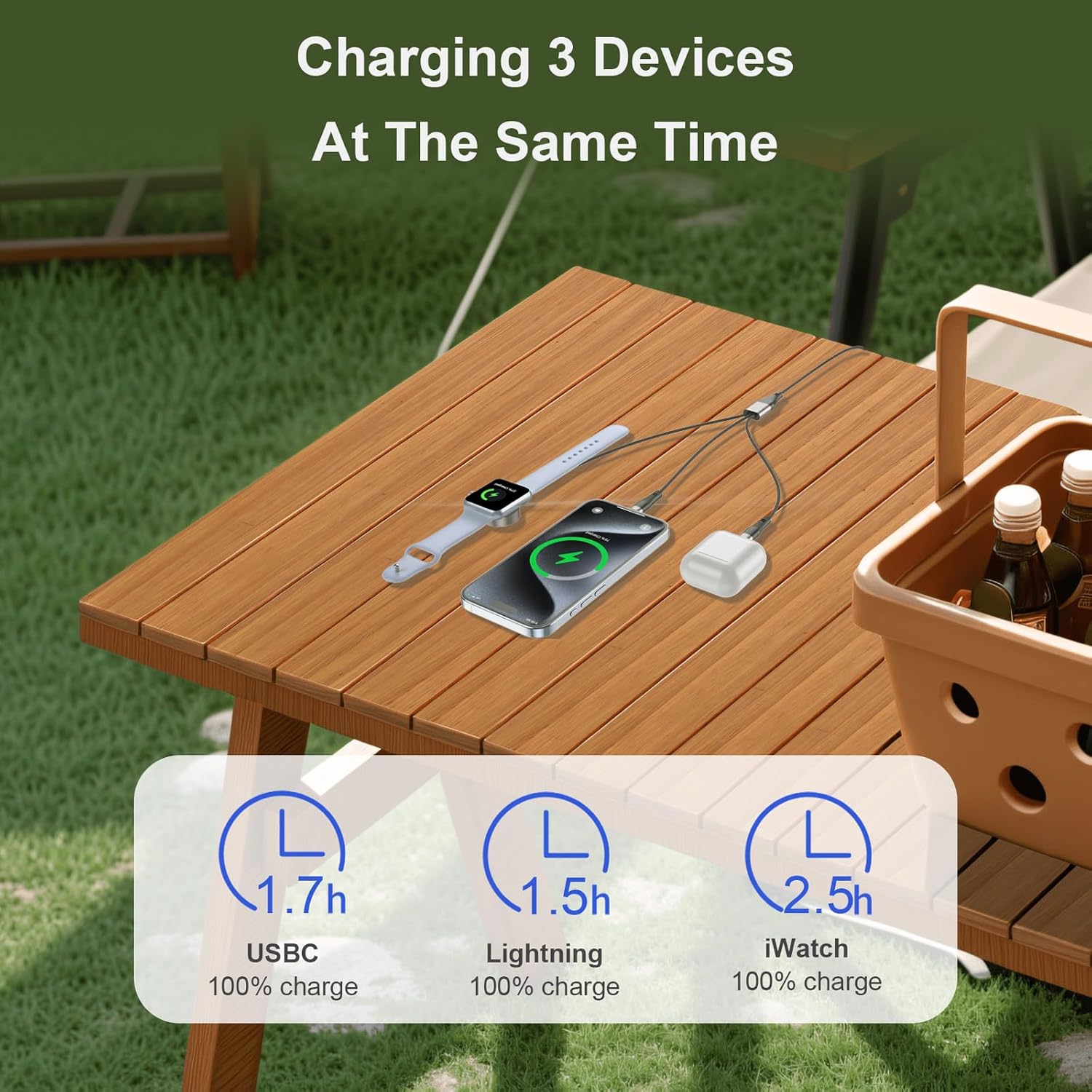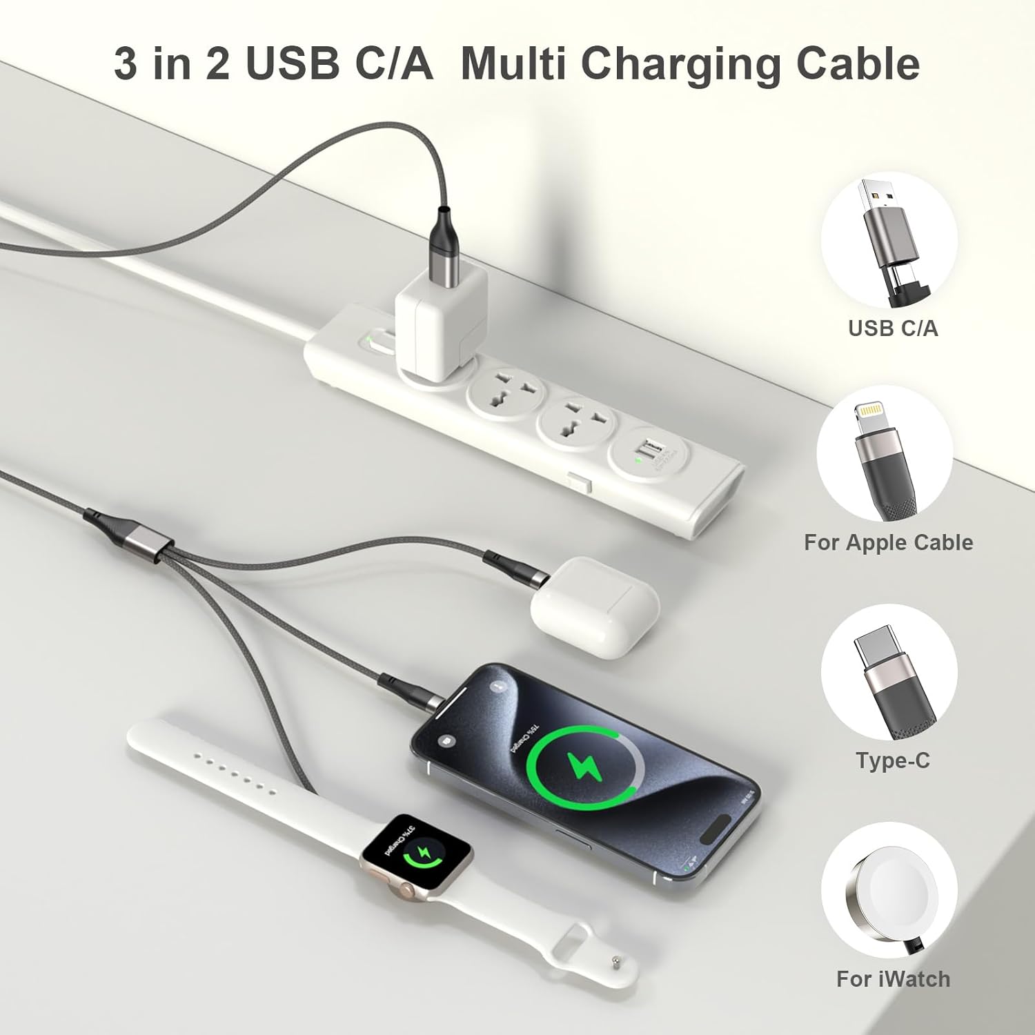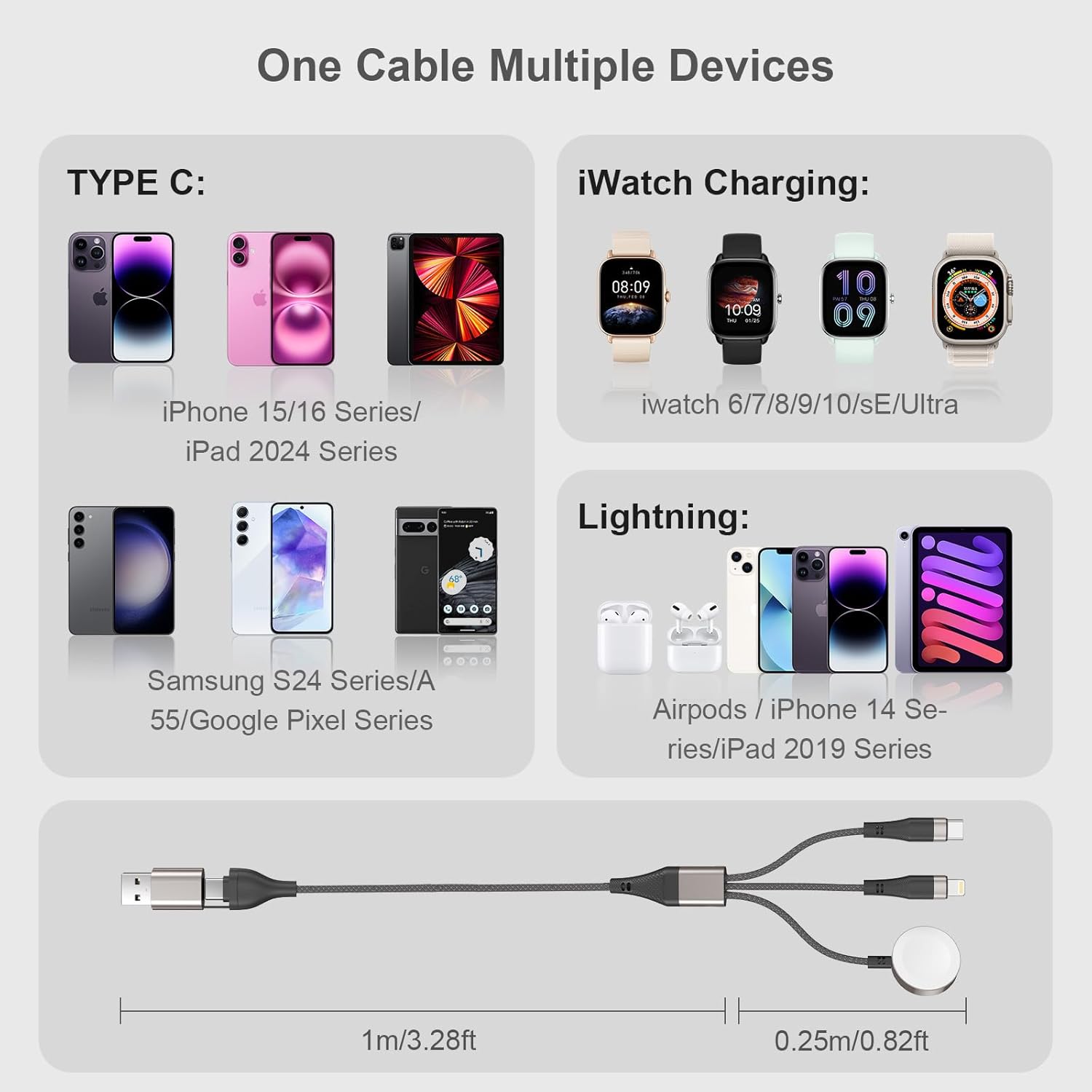 Editor's Pick: This fast charging cable set includes two 4-foot three-in-one charging cables that integrate Type-C, Lightning connectors, and a magnetic Apple Watch charger, allowing you to charge multiple devices simultaneously. Made with 48-strand nylon braiding and aerospace-grade aluminum connectors, these cables offer exceptional durability. Built-in multiple safety protection systems support fast charging, making them perfect for travel or daily use.