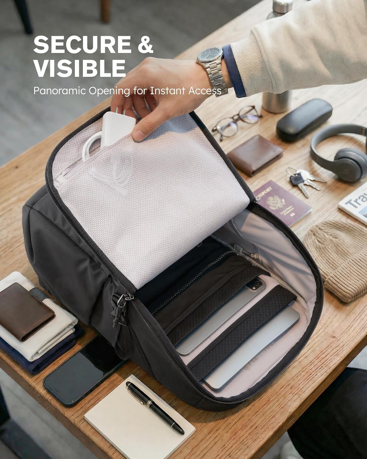 Editor's Pick: This 30-liter travel backpack features eco-friendly waterproof RPET fabric and waterproof zippers, effectively protecting against everyday splashes. The main compartment has a full-view design for quick access to items and includes a zipper with a lock hole. Inside, there are padded compartments for a 15.6-inch laptop and 12.9-inch tablet, plus a hidden AirTag pocket. Multiple functional pockets include a top zippered pocket, side water bottle pockets, and a hidden valuables pocket for convenient storage. It meets airline carry-on size requirements, making it perfect for short business trips or daily commuting.