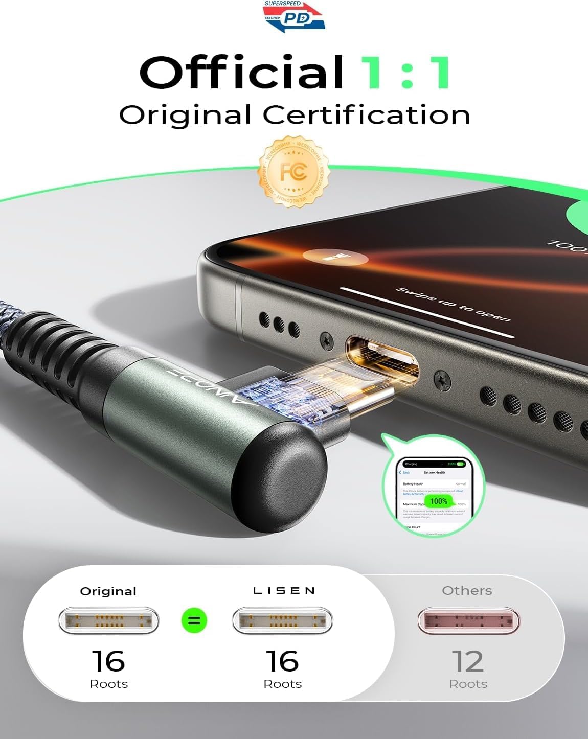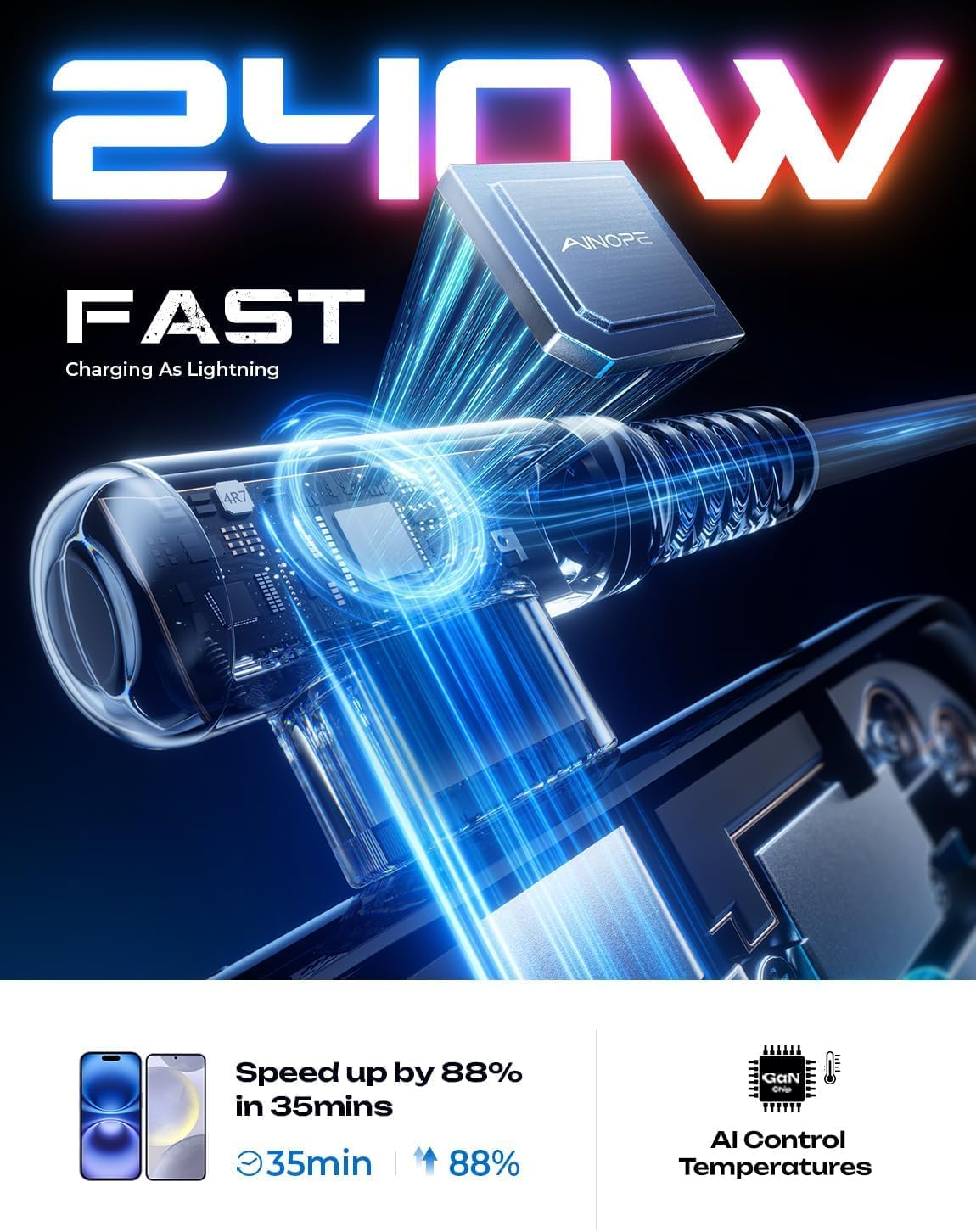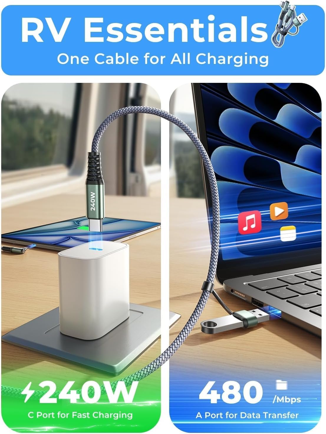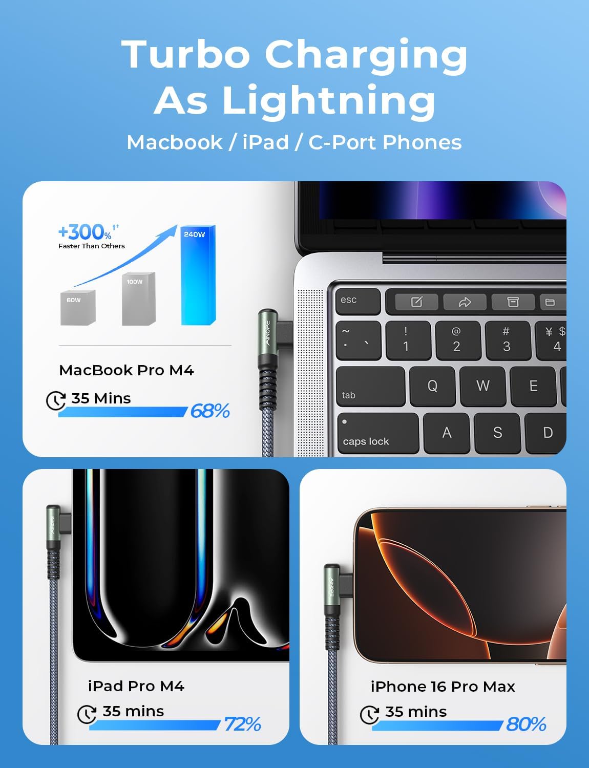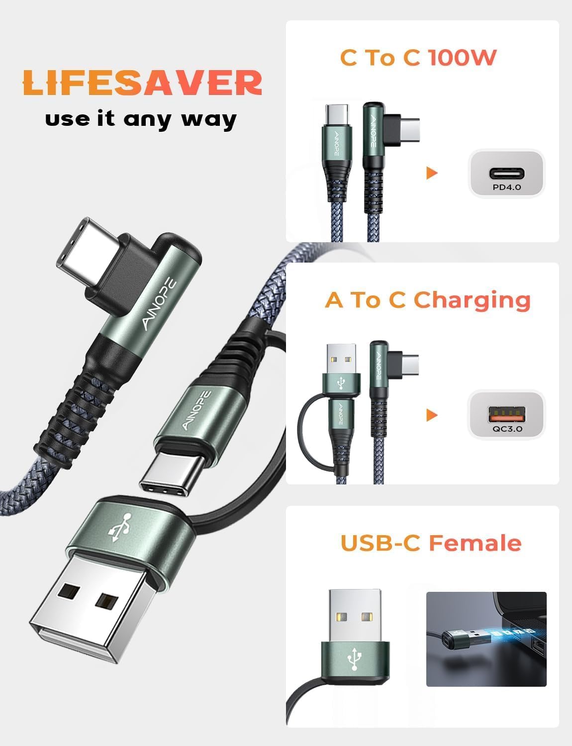 Editor's Pick: This 10-foot USB-C fast charging cable supports up to 240W rapid charging and comes with a USB-A adapter, making it compatible with various devices. Its unique 90-degree angled design enhances grip comfort and helps protect the cable connection. Made with double-braided nylon material and having passed over 40,000 bend tests, it offers excellent durability. The built-in smart chip identifies devices and adjusts power accordingly, supporting trickle charging mode to protect battery health.