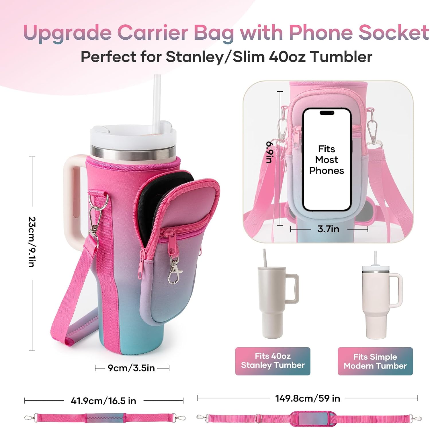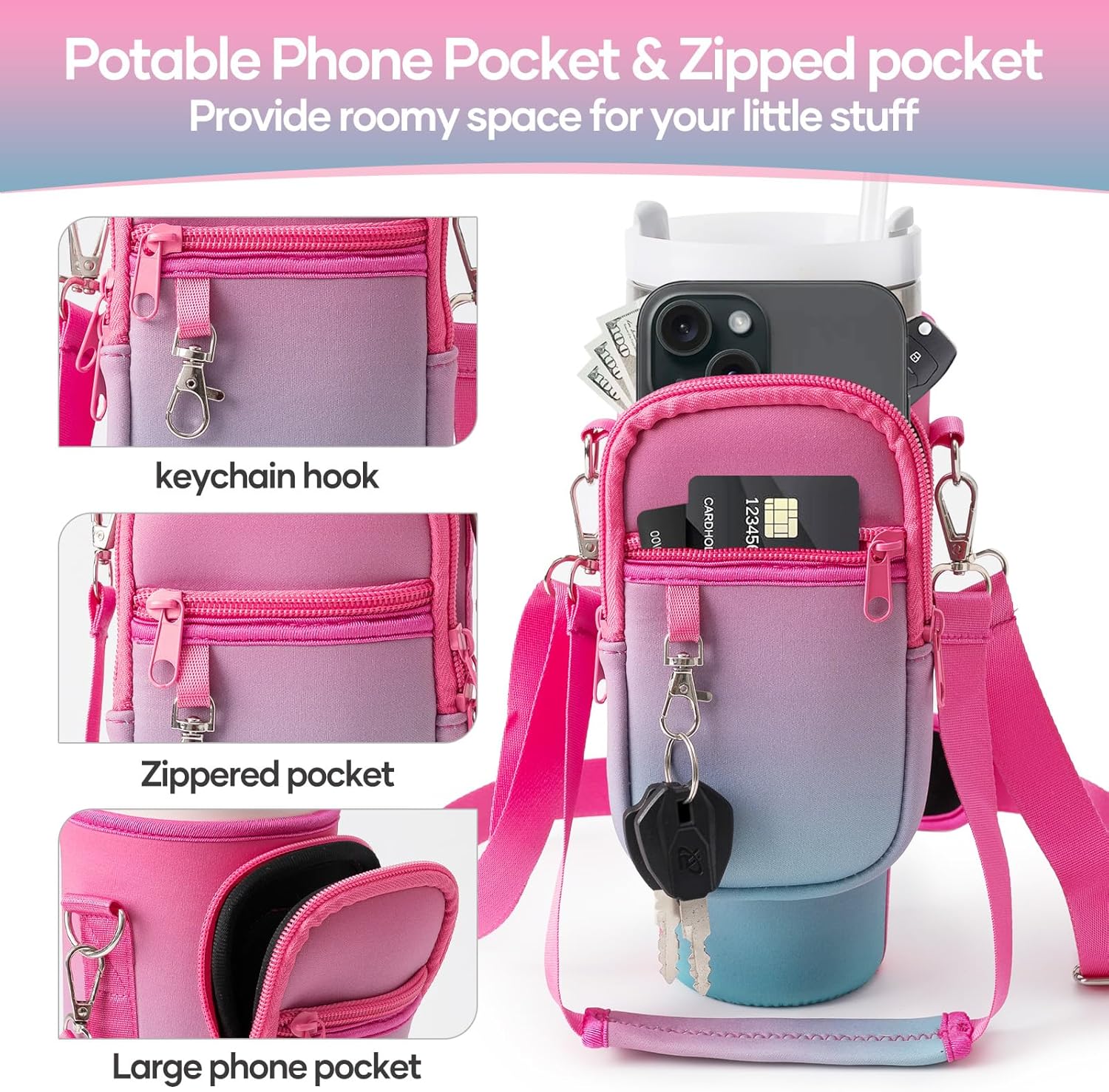 Editor's Pick: This storage bag, designed for Stanley 40/30oz water bottles, is made of neoprene material, providing waterproof and shockproof protection while enhancing insulation. It features a double zipper pocket design—one pocket can hold your phone, and the other can store small items like coins and IDs, plus a key hook. The shoulder strap is adjustable in length (27.5–50 inches), making it easy to wear crossbody or carry by hand. The metal buckle is sturdy and durable, perfect for outdoor activities, commuting, workouts, and more.