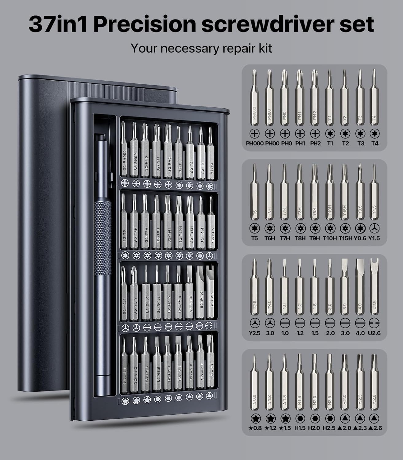 Editor's Pick: This precision screwdriver set includes 37 different bits (Phillips, flathead, Torx, security Torx, pentagon, hex, etc.), featuring an interchangeable bit design that's compact and comprehensive. The bits are made of S2 steel with high hardness and excellent wear and corrosion resistance. The magnetic driver head easily attracts and secures small screws, while the rotating cap design allows for smooth operation. The textured, ergonomic handle provides excellent grip, and the durable storage case with lock clasp enables safe storage and portability. Perfect for repairing phones, computers, watches, glasses, and various electronic devices.