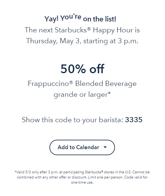 - Starbucks Happy Hour is Thursday, May 3.
