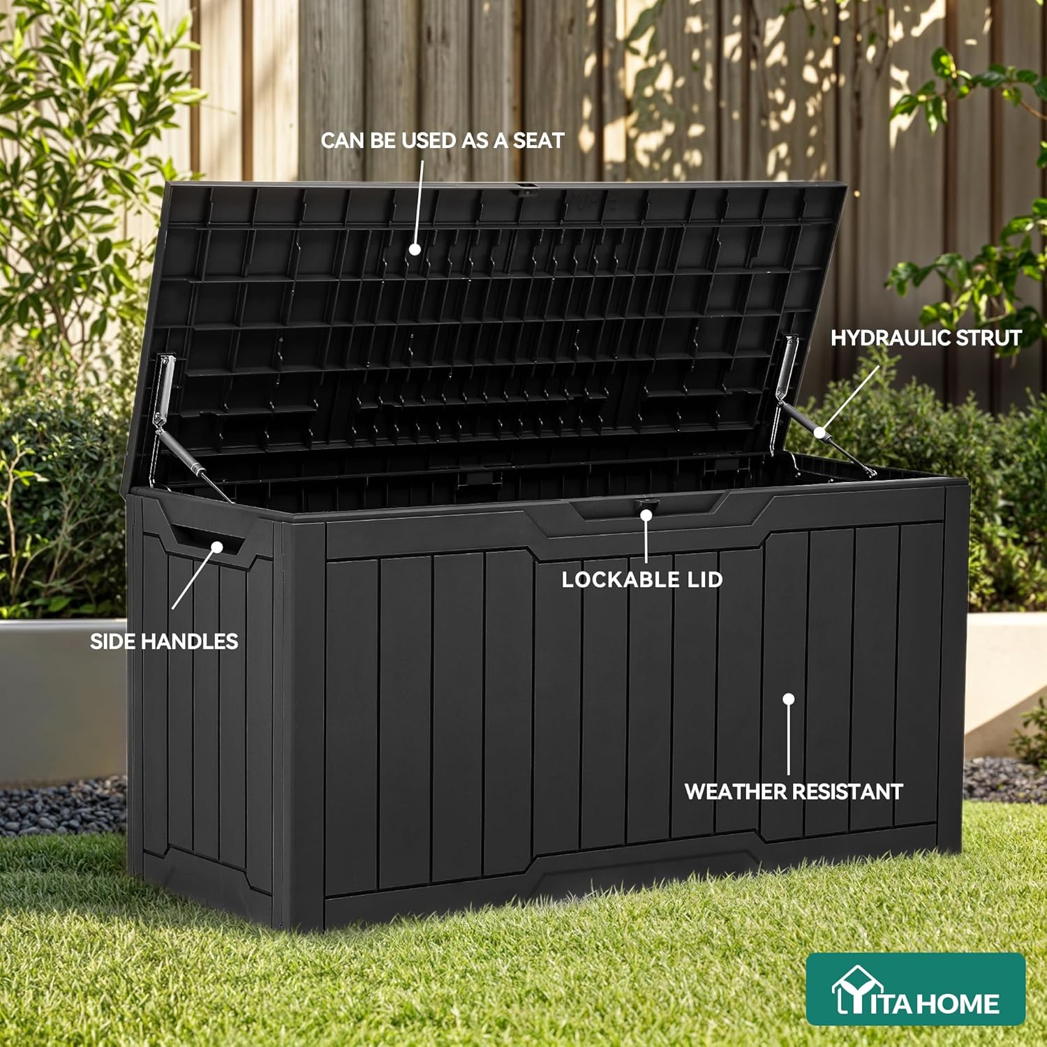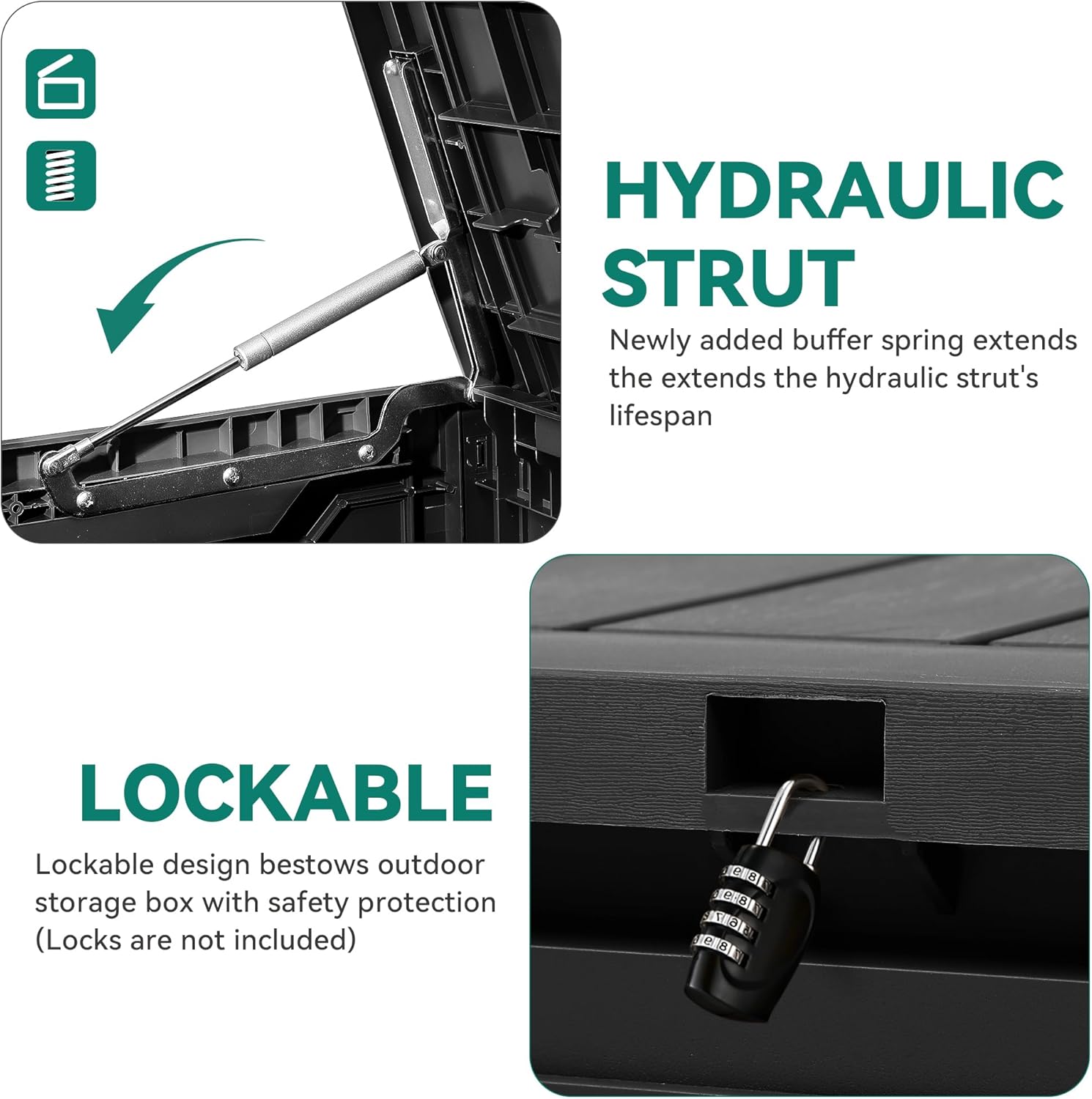 Editor's Pick: This outdoor storage box features a spacious 100-gallon capacity and is made from weather-resistant resin with waterproof, rust-resistant, UV-resistant, and fade-resistant properties, making it ideal for long-term outdoor use. The box includes a lock design to keep your items secure. Hydraulic support rods ensure smooth and safe opening and closing, while side handles make it easy to move. Its unique wood-grain texture blends naturally with patio or garden environments, and the sturdy lid can double as extra seating, supporting up to 485 pounds.