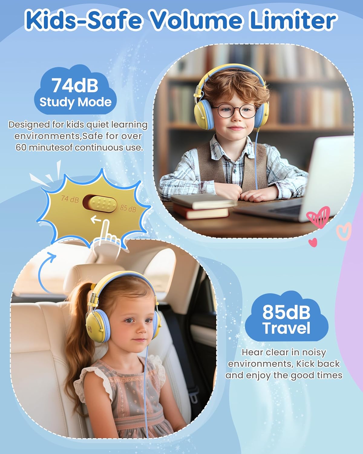 Editor's Pick: These children's headphones feature a 74/85dB two-level volume limiting button, allowing parents to monitor and protect their children's hearing. Made from environmentally friendly materials that meet safety certifications. Equipped with 40mm composite diaphragm drivers that deliver clear stereo sound. The headband is foldable for easy storage and transport, while the tangle-free cable design ensures durability. Memory foam ear cushions and a lightweight frame (only 8 ounces) ensure comfort during extended wear, making them suitable for learning, travel, and various scenarios. Compatible with all devices featuring a 3.5mm audio jack.
