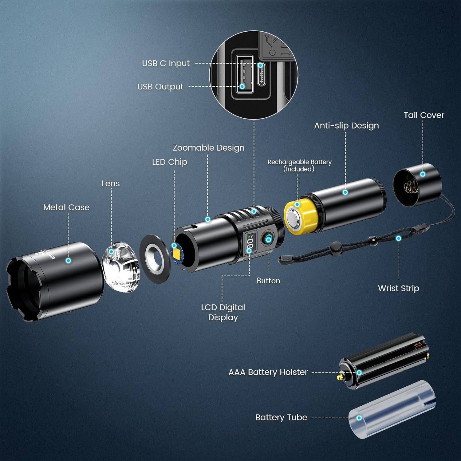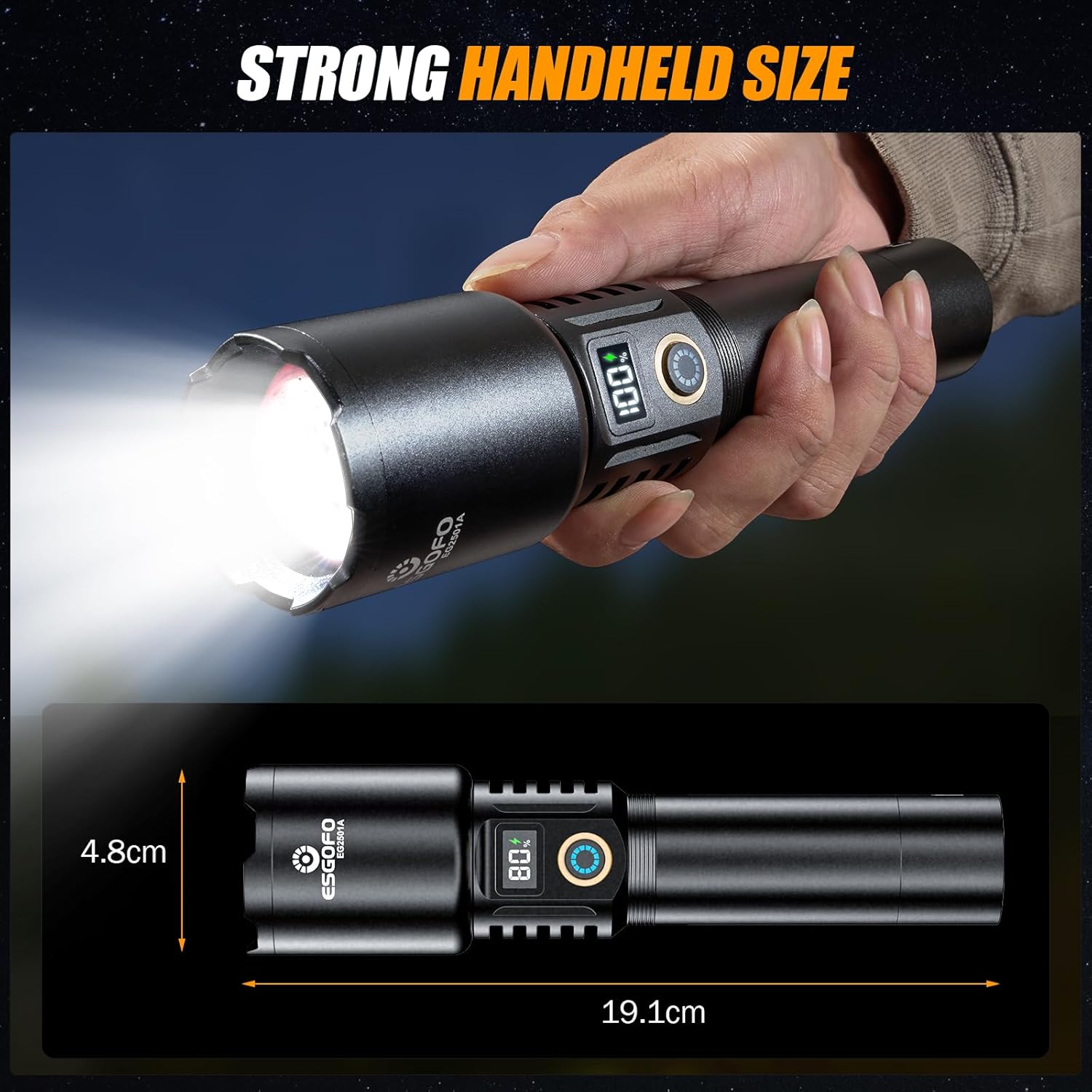 Editor's Pick: This high-brightness flashlight can reach up to 90000 lumens with a beam distance of 3280 feet and features a spotlight zoom function. It has a built-in 6000mAh rechargeable battery with up to 15 hours of runtime and an LCD battery level display. Made of aircraft-grade aluminum, it's durable and waterproof, perfect for camping, hiking, or emergency use. Supports USB-C charging and can also function as a power bank to charge other devices.