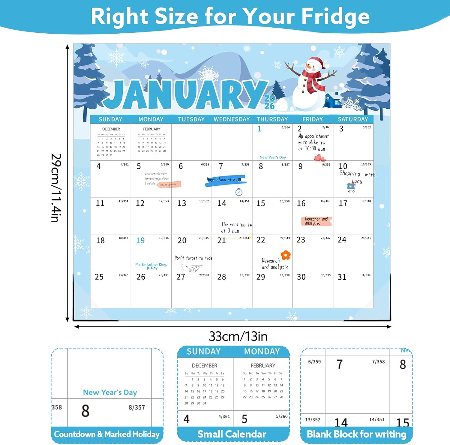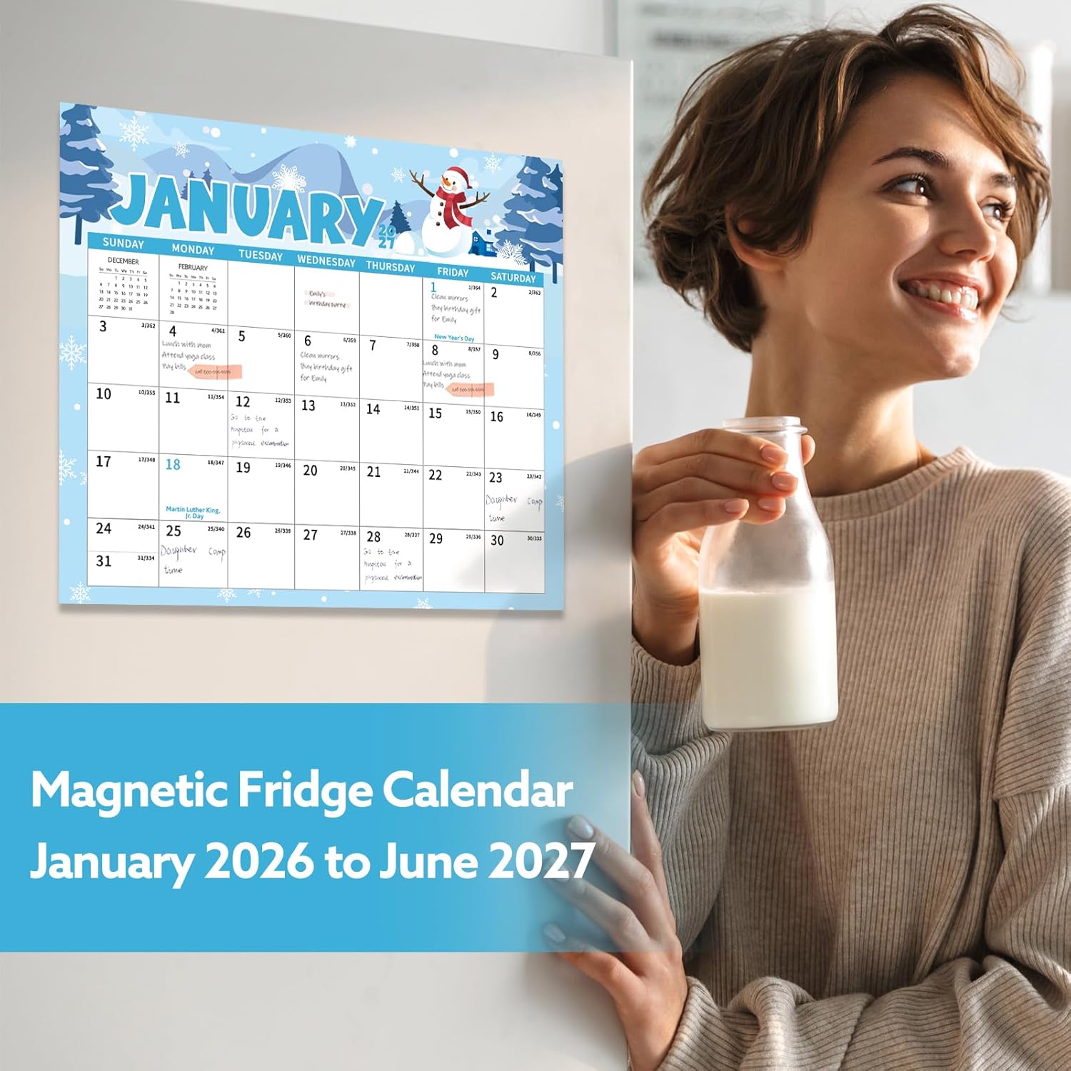 Editor's Pick: This magnetic refrigerator calendar covers 18 months from July 2026 to December 2027, featuring holiday-themed designs with a fresh and lively style. The back has magnetic strips that firmly attach to refrigerators and other metal surfaces. Made with 120g paper, it allows smooth writing without ink bleeding through, and the top binding makes it easy to tear off each month. Perfect for use in homes, offices, or classrooms to help plan schedules and mark important holidays.