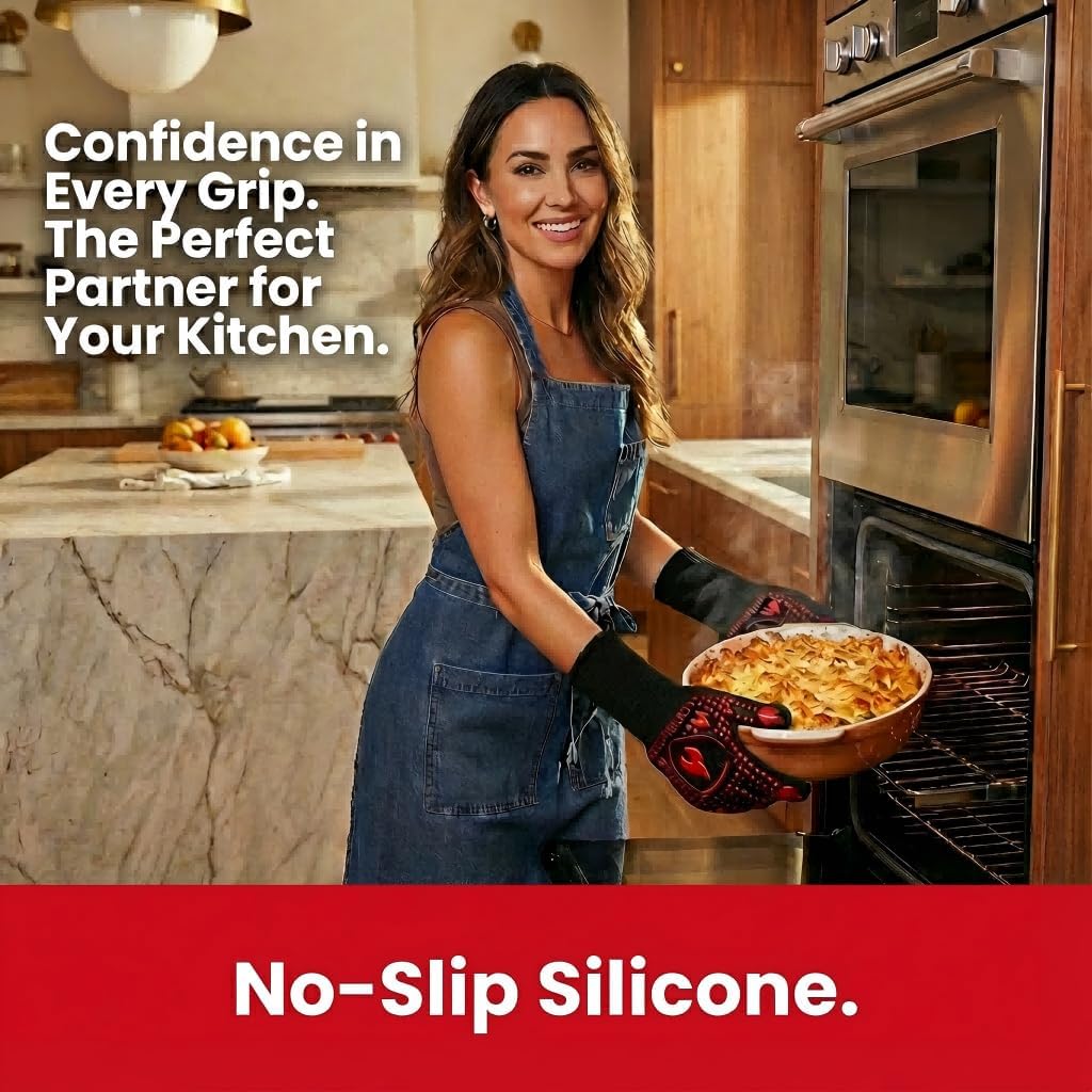 Editor's Pick: These heat-resistant gloves feature a three-layer design with an anti-slip silicone outer layer, heat-resistant fiber core middle layer, and breathable cotton-polyester blend inner layer for comfort. Certified to EN 407:2004 standards, they can withstand temperatures up to 1472°F (800°C) and are suitable for ovens, grills, air fryers, and various cooking scenarios. They offer both flexibility and protection while being easy to clean and store.