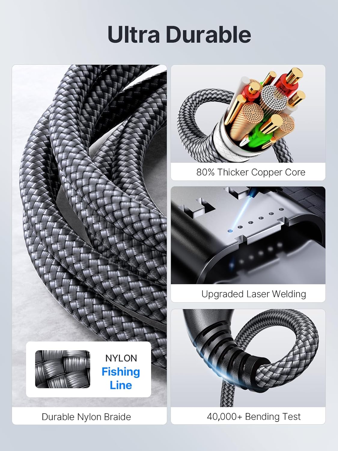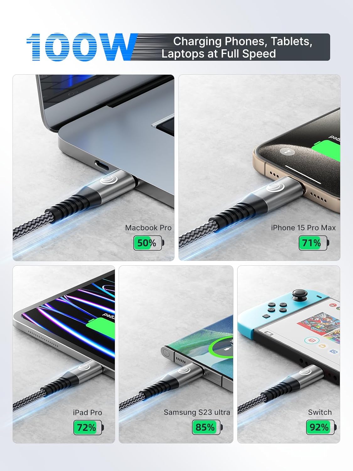 Editor's Pick: This USB-C to USB-C braided charging cable features a dual C-port design, supporting up to 100W PD fast charging protocol for quickly charging MacBook Pro, iPhone, and other devices. The cable body uses high-strength nylon braiding technology, combined with a one-piece molded connector and aluminum alloy shell, enhancing durability and heat dissipation. Lab tested to withstand over 40,000 bends. The built-in E-Mark chip ensures charging safety and compatibility, suitable for various brands of phones, tablets, laptops, and gaming devices.