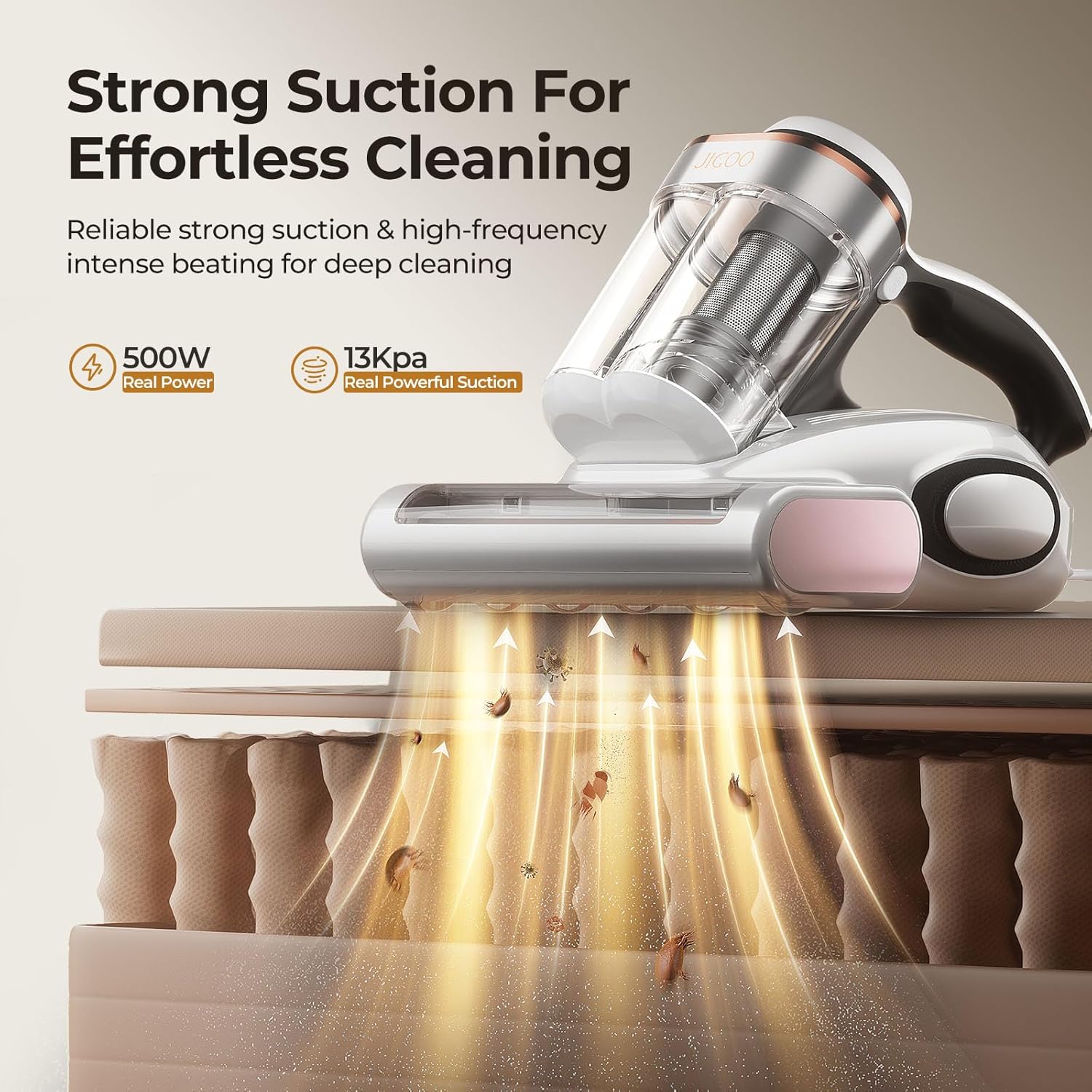 Editor's Pick: This dust mite vacuum features a powerful 500W motor, delivering 13KPa strong suction with a main brush rotating at 13,000 times per minute, effectively removing dust and pet hair. The built-in intelligent dust sensor automatically detects and displays the dust level on your mattress, with the indicator light turning green when cleaning is complete. It integrates a 245nm UV light and ultrasonic technology, complemented by a 130°F (55°C) heating function that helps eliminate various microorganisms. The vacuum comes with a 16.4-foot (5-meter) power cord for convenient cleaning across larger areas.
