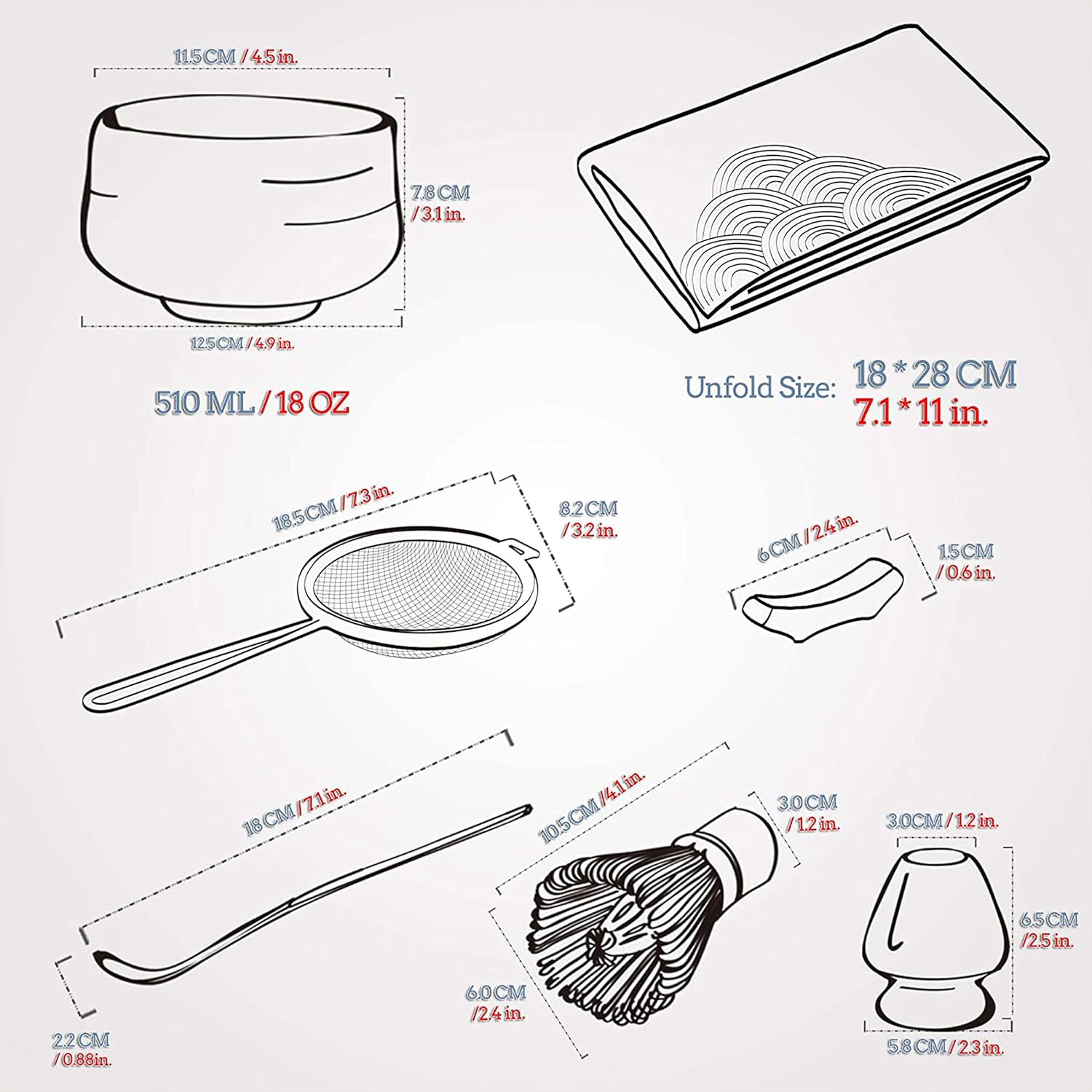 Editor's Pick: This matcha set includes seven pieces: a ceramic bowl, bamboo whisk, tea scoop, whisk holder, scoop stand, tea cloth, and tea powder sifter. The bamboo whisk is handcrafted from premium bamboo with approximately 100 fine tines and treated with vegetable oil for durability. The ceramic bowl features a unique pouring spout, making it easy to share with friends and family. With a consistent color scheme, this set is perfect for making healthy beverages like matcha lattes at home or in the office, allowing you to enjoy the pleasure of handcrafted drinks.