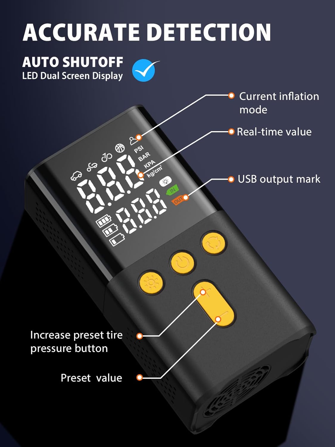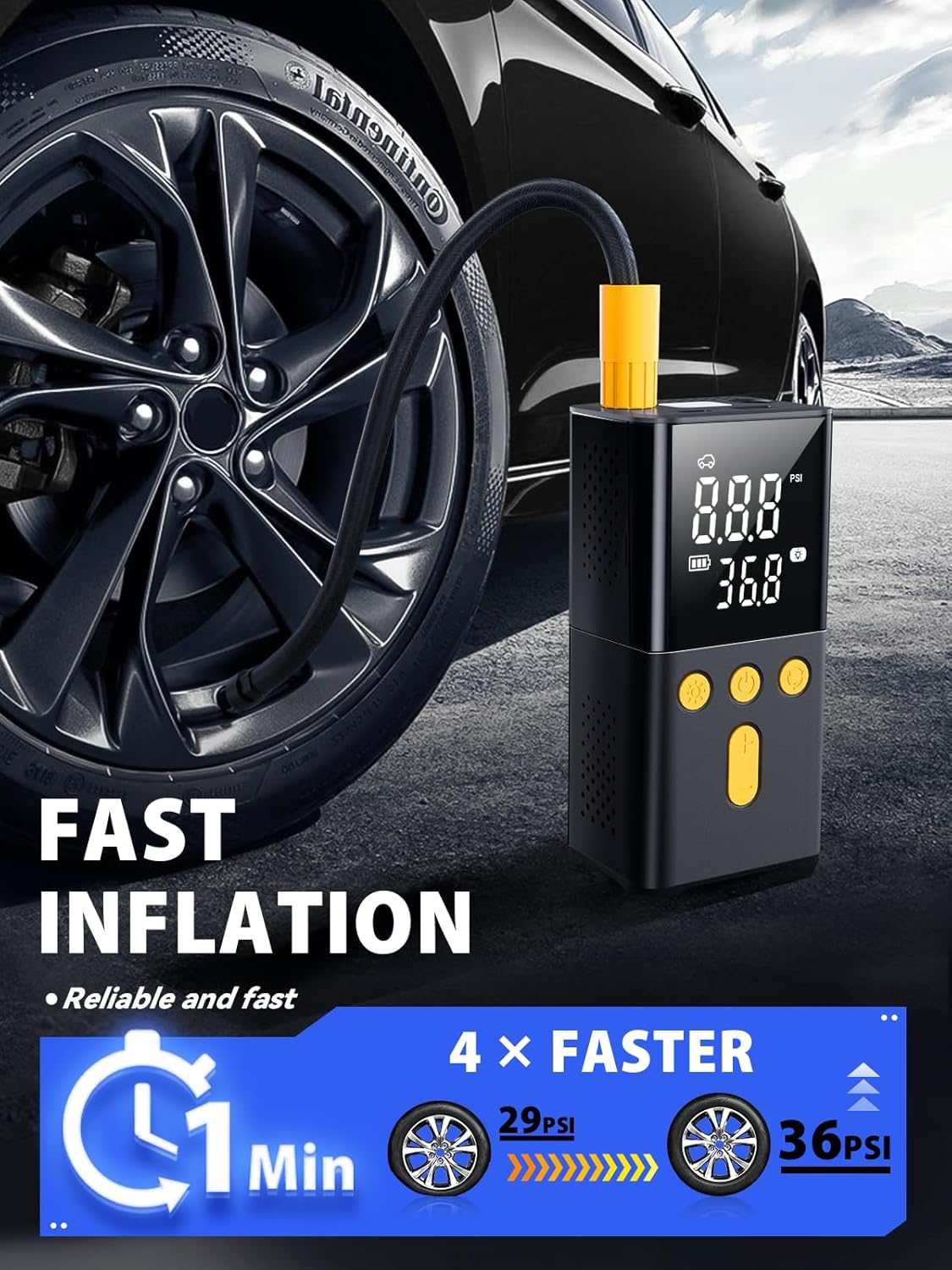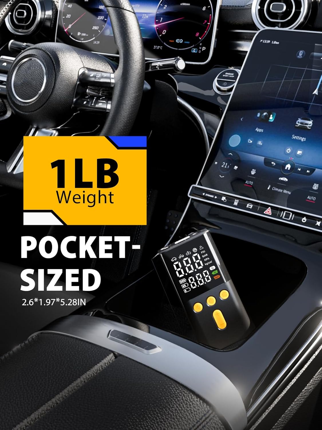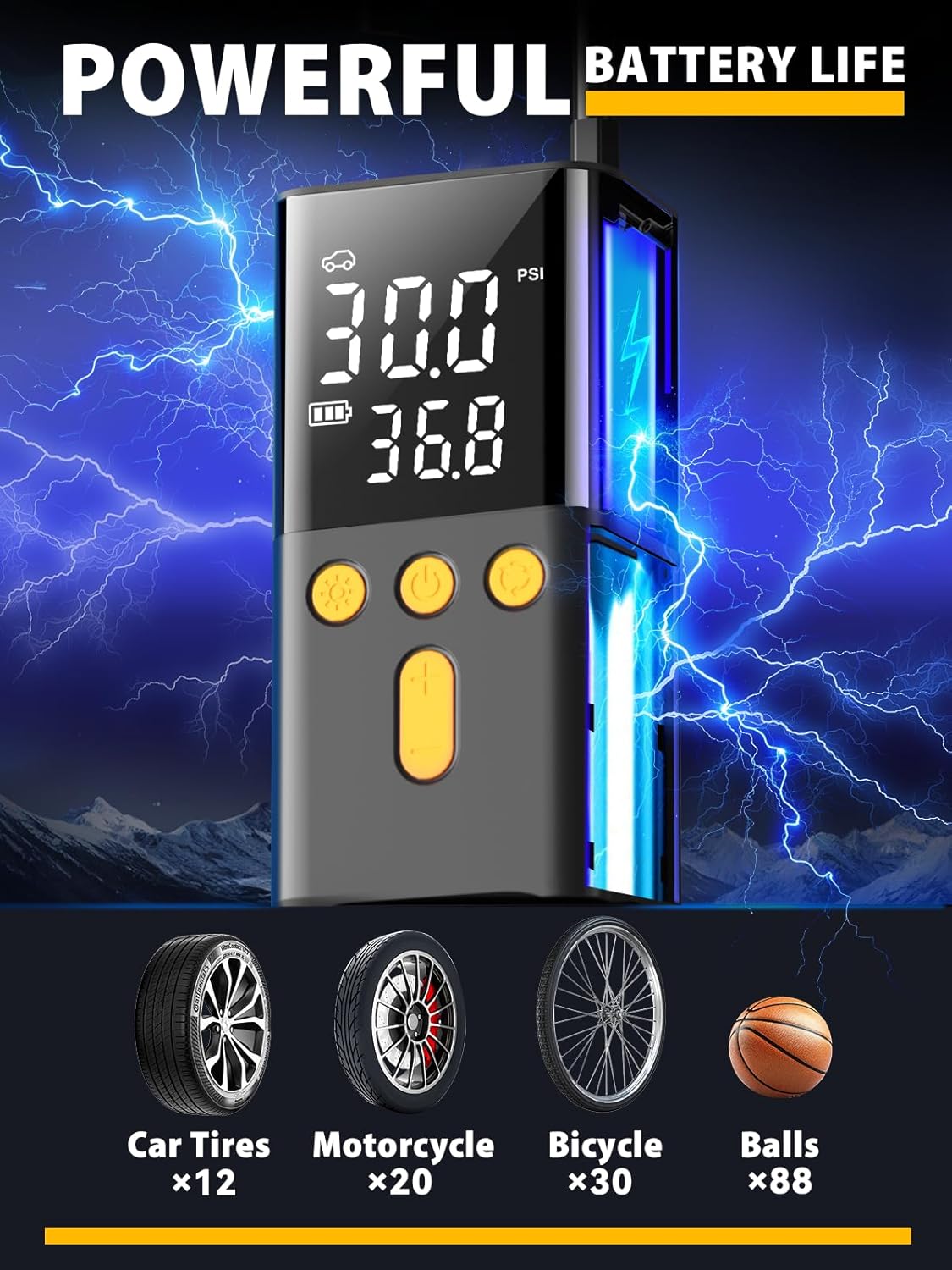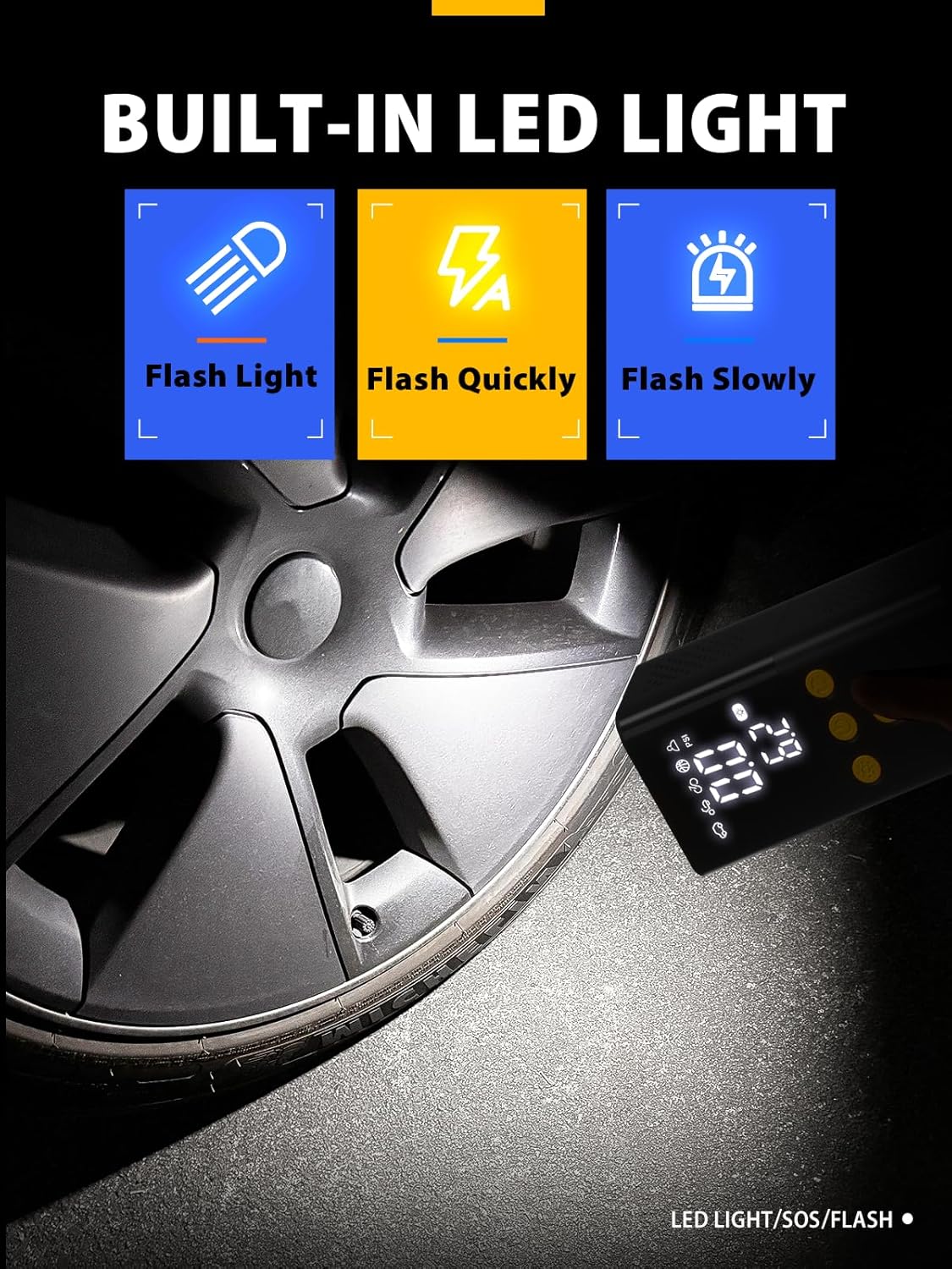 Editor's Pick: This portable car air pump supports up to 150 PSI pressure and features a large dual digital display for clear readings. It comes with multiple preset modes for cars, motorcycles, bicycles, and balls, plus customizable pressure settings. The built-in smart presets and auto-stop function automatically shut off when the desired pressure is reached, making operation worry-free. It inflates quickly while maintaining relatively low noise levels. The compact and lightweight design includes a built-in LED light and can serve as a power bank to charge devices, making it perfect to keep in your vehicle for emergencies.