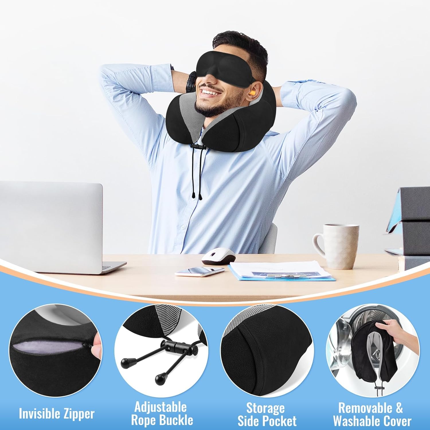 Editor's Pick: This neck pillow features premium memory foam filling that is soft and conforms to the curves of your neck, providing comfortable support. The ergonomic curved design effectively supports the head and neck, reducing strain. The pillowcase is made from breathable fabric and includes an adjustable elastic strap to accommodate different neck sizes. Thoughtful design details include a hidden zipper, portable storage bag, and complimentary eye mask and earplugs, making it convenient for travel and suitable for various settings including airplanes, cars, offices, and home.
