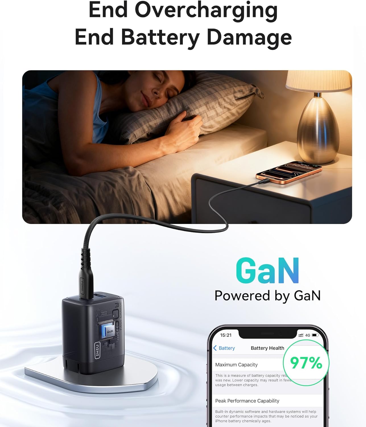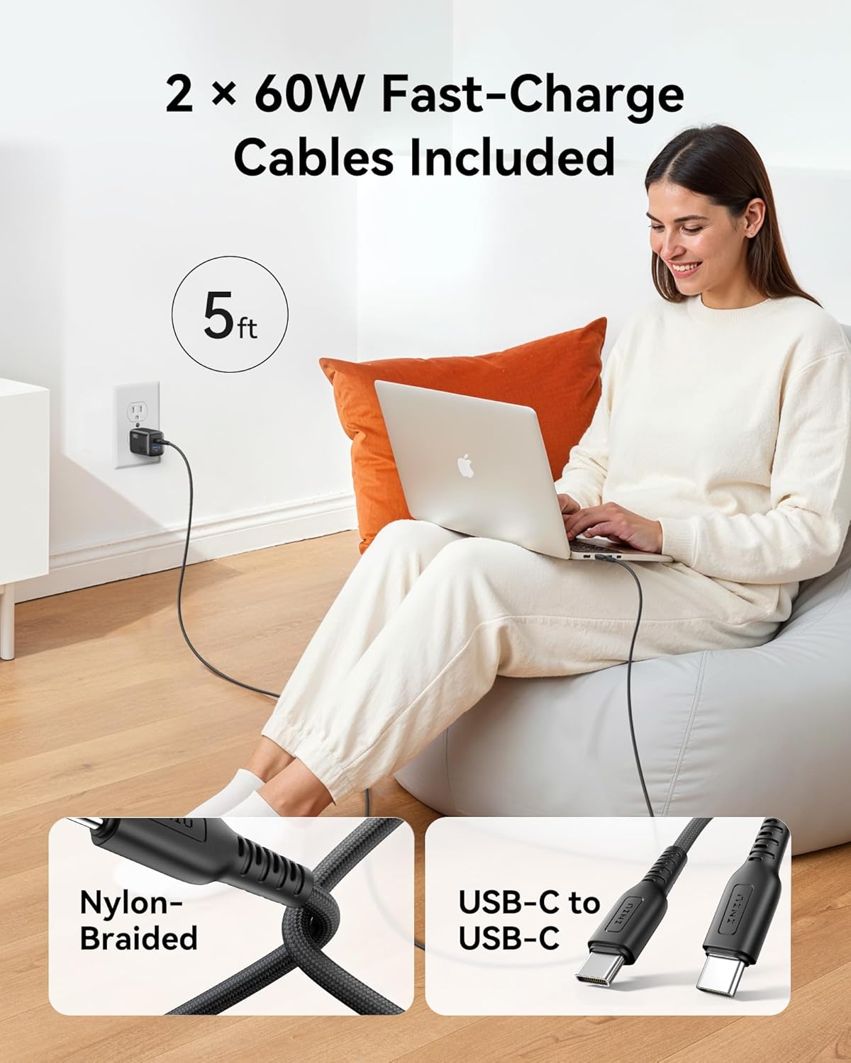 Editor's Pick: This 30W USB-C charger set includes two charging heads and two fast charging cables. It uses GaN (Gallium Nitride) technology for safer and more efficient charging, features a compact size with foldable plug for easy portability. The dual-port design allows charging two devices simultaneously and is compatible with various phones and laptops.