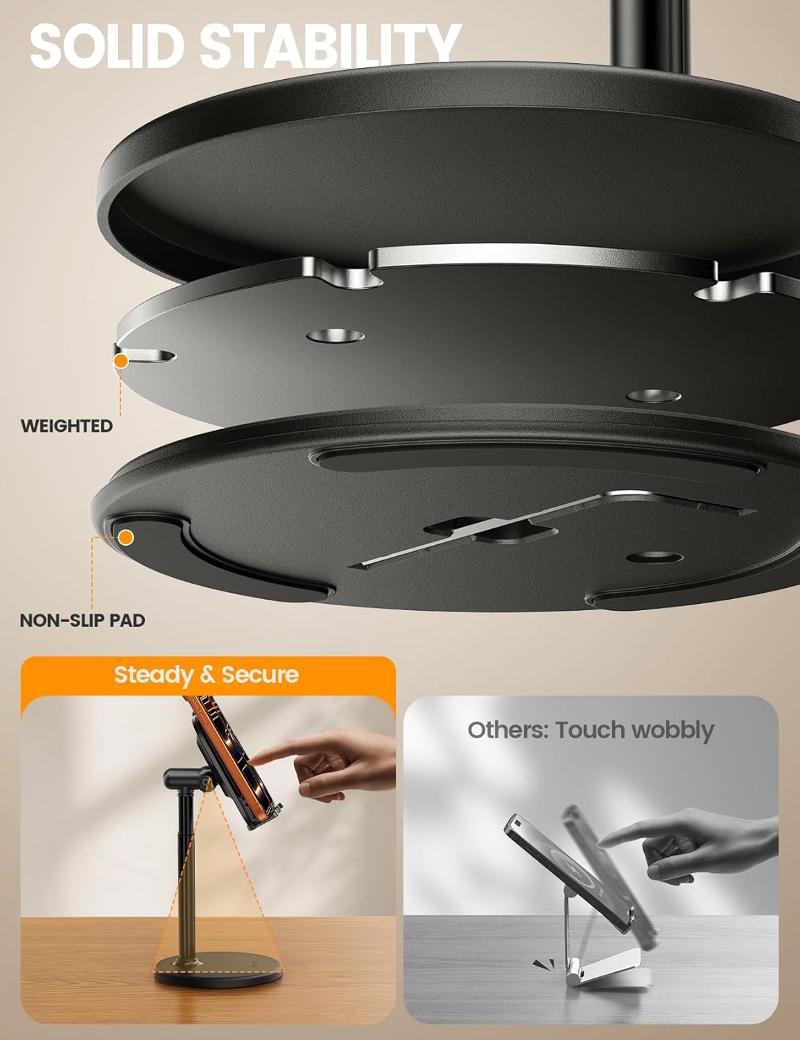 AI Review Summary: ⭐Amazon Rating: 4.6/5 (1,025+ Reviews). Users generally report that this phone stand has sturdy materials, easy assembly, and a minimalist adjustable design, making it perfect for desktop work or video calls.