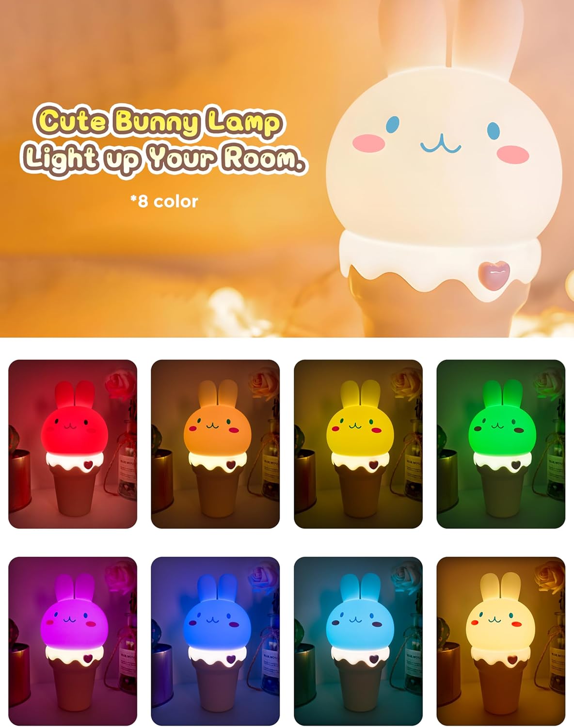 Editor's Pick: This night light combines an adorable bunny and ice cream design, adding a fun touch to bedrooms or children's rooms. It supports easy mode-switching with a gentle tap. The built-in rechargeable battery eliminates the need for frequent replacements. It offers 7 color-changing options and a warm light mode to create different atmospheres. Equipped with smart timer functions (15 or 30 minutes) and a magnetic design for easy handling and cleaning.