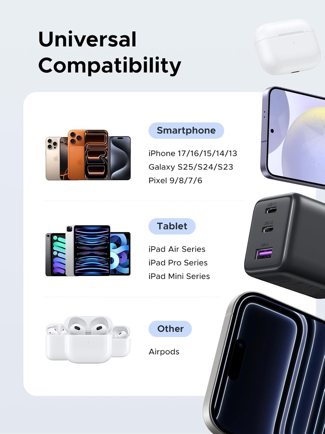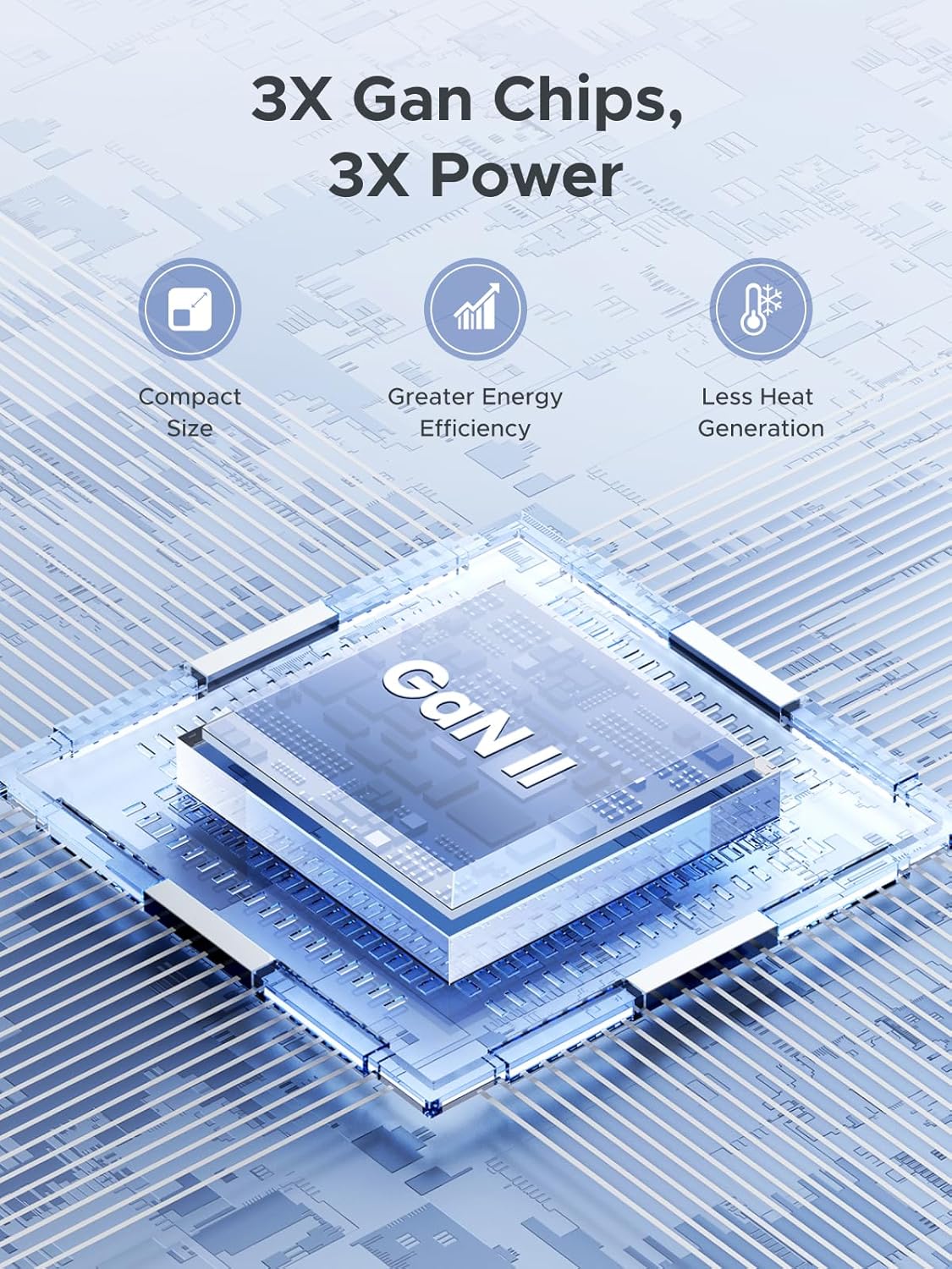 Editor's Pick: This compact charger features GaN II chip technology for a smaller, travel-friendly size. Equipped with 2 USB-C ports and 1 USB-A port, it can power three devices simultaneously. It supports multiple fast charging protocols including PD, QC, and PPS, and includes temperature detection and multiple circuit protection features for safe and efficient charging.