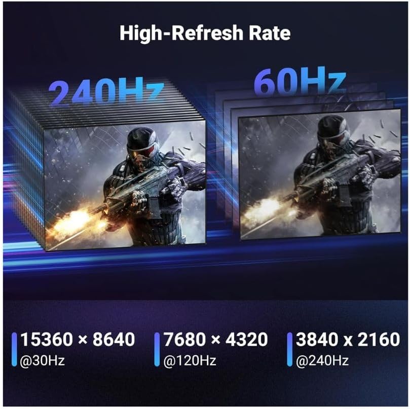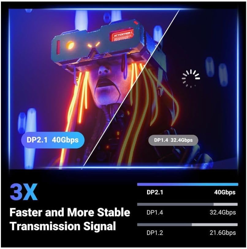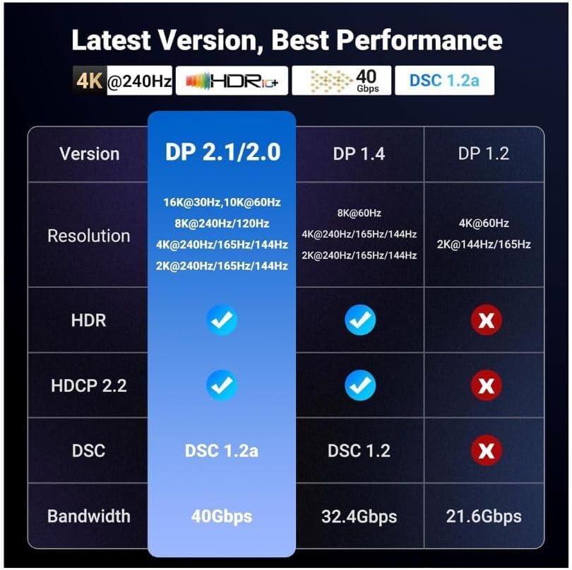 Editor's Pick: This DP 2.1 cable is VESA certified and supports up to 40Gbps bandwidth, capable of delivering 8K@240Hz or 16K@30Hz (with DSC) high-resolution output. The braided cable and aluminum alloy housing enhance durability and heat dissipation. It supports FreeSync, G-Sync, HDR, and HDCP 2.2, compatible with mainstream graphics cards and monitors, providing stable and lag-free signal transmission for gaming and high-definition multimedia.