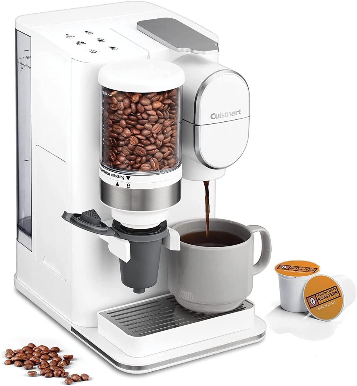 Editor's Pick: This Cuisinart single-serve coffee maker features an integrated conical burr grinder that automatically grinds coffee beans into a reusable filter cup, preserving fresh flavors. It supports three cup sizes: 8, 10, and 12 ounces, and is compatible with various single-serve coffee pods. Equipped with a 48-ounce removable water reservoir, charcoal water filter, and removable drip tray for easy cleaning and travel mug accommodation.
