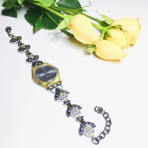 💜这个紫色点缀的手表是我多年前特别特别喜欢的一款手表,可谓一眼望去便是一见钟情💘品牌是当年在国内特别火的Swatch,这款表购于上海,因为有手链式的设计,由数个嵌紫