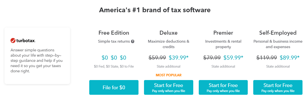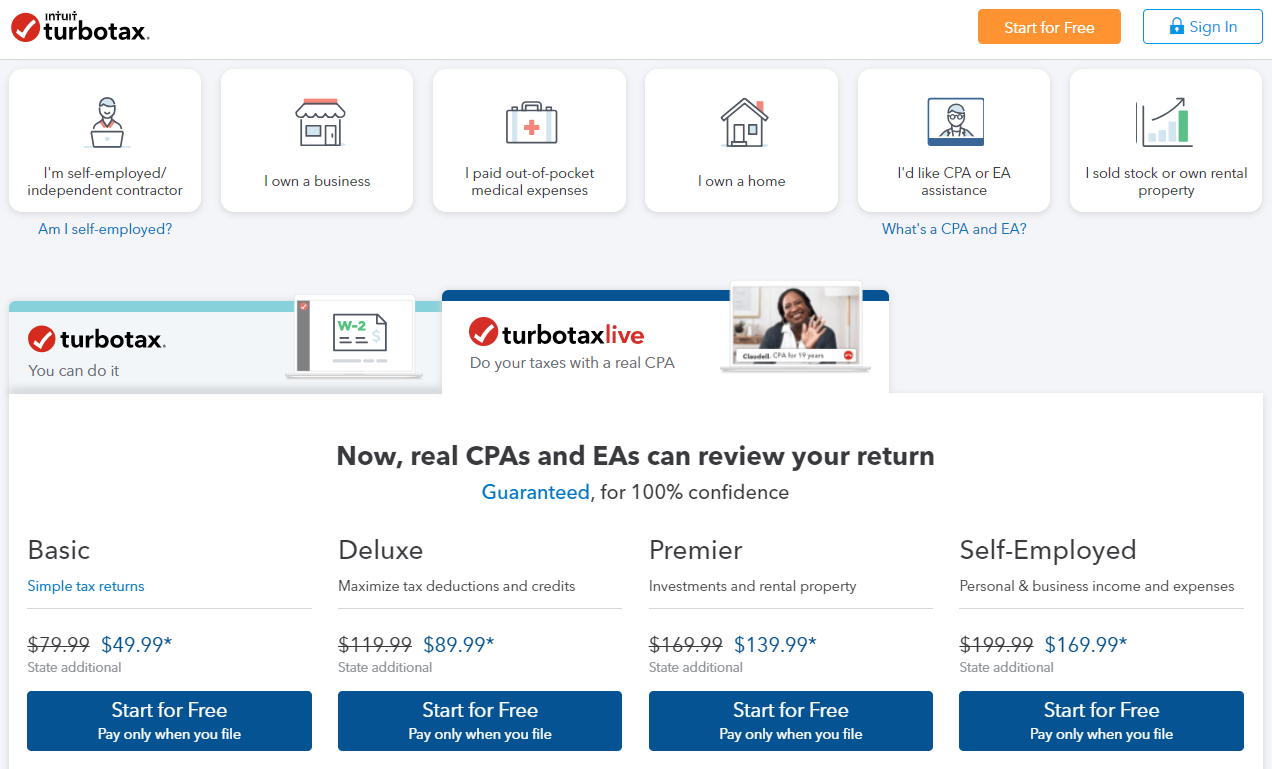 TurboTax offers different versions of services to meet your tax return needs. With TurboTax, you can always start for free, and pay only when you file.