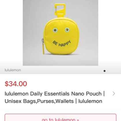 : The lululemon smiley face bag, the Daily Essentials Nano wristlet, but it can't be found on the website now—not sure if it's out of stock. lululemon的笑脸包,daily essentials nano手拿包,但是网站现在搜不出来,不知道是不是没货了