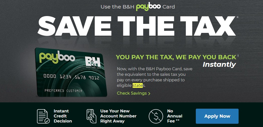 - With the B&H Payboo Card, save the equivalent to the sales tax you pay on every purchase shipped to eligible states.