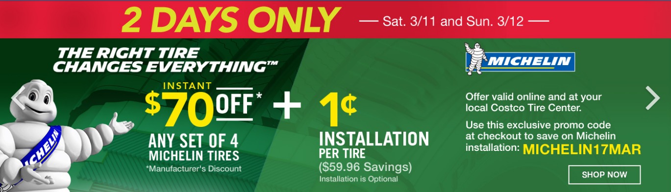 - Costco offers Costco Members: Set of 4 Michelin Tires w/ Installation savings, $70 off Any Set of 4 Michelin Tires + $59.96 off Installation via coupon code "MICHELIN17MAR".