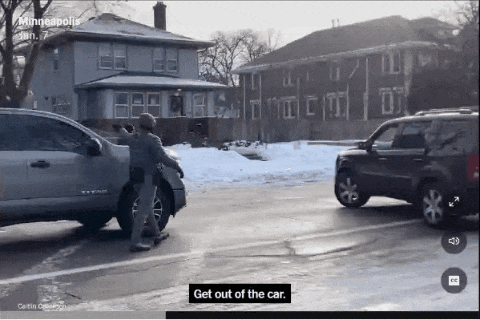 紧接着一名执法人员试图拉开驾驶座车门,同时把手伸进车窗。另一名执法人员从 SUV 车头前方横穿而过。