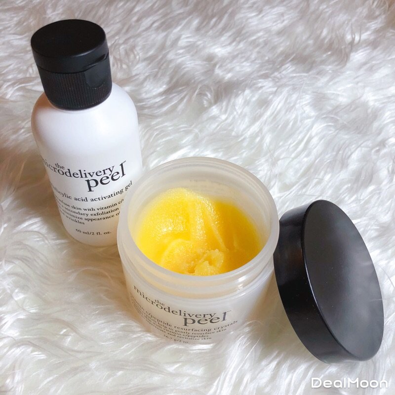 Philosophy The Microdelivery Peel 是一款只需5分钟的面膜~非常适合一些赶时间的美眉们~这款面膜是有两步步骤的,第一部是把橘色的面膜涂在脸上,稍微按摩一分钟。这里面含有VC成份,也有颗粒所以能去角质。当把第一部按摩到脸上后,就把第二步涂上去。涂上之后会有微微的热感(就几秒),之后就等3分钟就能清洗掉了~一共只需5分钟,非常方便。我喜欢一个星期用一次,可以给皮肤补充VC,同时也能去角质。