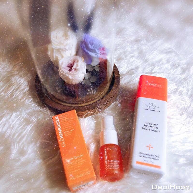 Drunk Elephant C-Firma Day Serum和 Olehenriksen Truth Serum~ 这两款都是很好用的早间精华。本来想从这两款里面选一款,可是可是可是两款都很好用!如果你们想先一款有带有VC的这两款肯定不会错。它们主打的功效是提亮肤色。那怎么选呢?两款产品都非常好吸收。Drunk Elephant的味道比较不好接受如果你们喜欢香香的那我建议选Olehenriksen,它的味道是淡淡的橙子🍊味~那如果你们是敏感肌肤的美眉们,那我建议你们选Olehenriksen,它会相对比Drunk Elephant温和很多,因为Drunk Elephant含有很高的Ascorboc Acid相对比较刺~它们两的质地Drunk Elephant会稍微比较浓一点,Olehenriken比较水所以也比较清爽~油性肌肤的美眉们选Olehenriken,干性肌肤的美眉比较适合Drunk Elephant哦。