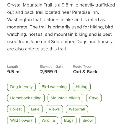 Mt. Rainier附近的Crystal Mountain Trial很美,雖然爬四個小時快斷腿,但到達山頂的時候感覺一切都值得!而且下山可以做免費的纜車超開心的(坐上去要$34,下山免費)感覺自己賺到了哈哈哈,結尾再去吃個韓國菜配啤酒,完美的一天!(所以⋯⋯熱量又吃回來了😂)